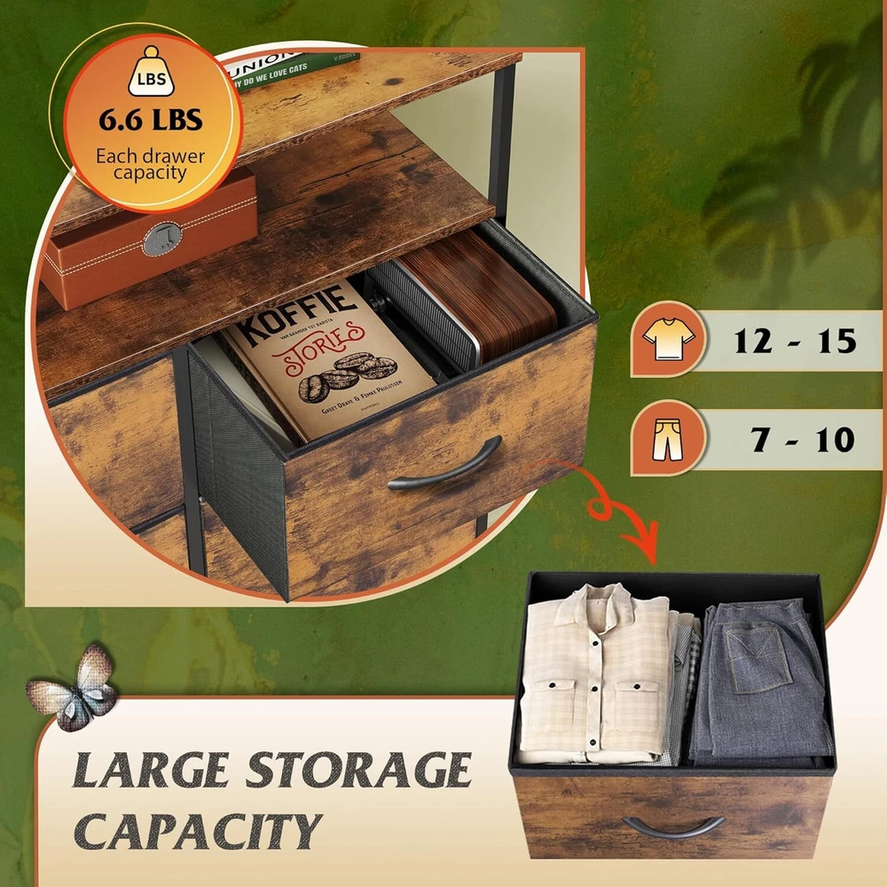 Product details: Multifunction Storage Tower: This fabric dresser is ideal for wherever you want to keep clutter under control, such as bedroom, closet, entryway, dorm, living room; and matches perfectly with other WLIVE dressers. Roomy Storage Space: The dresser for bedroom has 8 deep drawers and open shelves that are spacious and provide endless organizational possibilities. Wood top is great for placing frequently used items, keeping them in your reach. Sturdy and Durable: Strong steel frame, wooden top and high-grade non-woven fabric offer stable support and ensure years of use. The tall dresser has anti-tipping accessories to prevent incidents. 8 Drawer Chest: The double dresser features elegant easy-to-pull handles, water-resistant wooden top and 4 adjustable feet that can protect the floor from scratches. Adjustable feet are also designed for uneven ground. Overall Dimensions: The storage drawer unit measures 11.7"D x 31.50"W x 45.9"H. The chest of drawers comes with detailed instructions and tools needed for installation. Brand WLIVE Product Dimensions 11.7"D x 31.5"W x 45.9"H Color Rustic Brown Wood Grain Print Mounting Type Freestanding Room Type Bedroom,College,Office Material Wood Finish Type Rustic Number of Drawers 8 Style Raised Shelves
