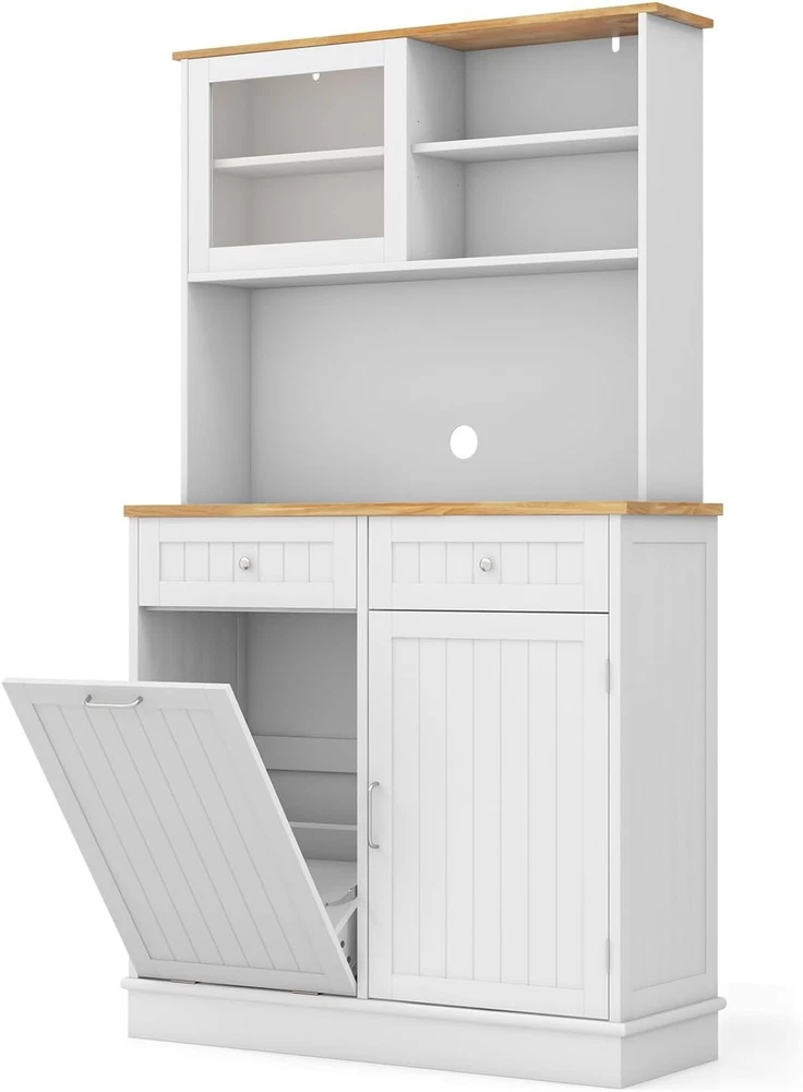 Product Description About this item Multifunctional Hutch Cabinet: 68” tall buffet cabinet combines the functions of closet, bar, T tilting garbage cabinet, storage cabinet and so on. Can be used as hutch cabinet, kitchen island, buffet sideboard, coffee bar cabinet, laundry basket. Large & Sorted Storage Space: Featuring storage hutch, 2 drawers and bottom cabinet, the pantry cabinet provides versatile storage options for your kitchen supplies. Plus, wide rubber wood countertop with cable management hole is a convenient spot to keep appliances with reach. Hidden Garbage Holder: This kitchen hutch cabinet features a hidden 10-gallon holder to conceal the waste’s unpleasant odors and prevent pets from digging up trash. Can not only this tilt out trash bin cabinet serve to be a waste bin in the kitchen, but also be used as a laundry basket in the laundry room, a recycle bin, a pet food bin in the living room. Note: Trash Bin is not included. Use with Convenience: The 3-position adjustable shelves in the food cabinet can maximize the storage capacity of upper and bottom cabinets, ensuring efficient utilization of space. In addition, the sliding tempered glass cabinet allows for more storage convenience. Plus, provides cable management holes for organizing cords. High Reliable Structure: Thickened board with tight connection casts a firmly constructed kitchen cupboard. When set against the wall, the kitchen hutch with trash can storage hold in place with anti-tip devices to prevent rocking or tipping. Description: Say goodbye to a messy and smelly kitchen! This kitchen pantry cabinet features a hidden 10-gallon garbage holder, allowing you to conveniently dispose of waste while keeping it out of sight. With a spacious countertop and drawers, you will get ample storage space for essentials. The adjustable shelves provide flexibility to accommodate your storage needs for various items. Besides, the sliding tempered glass cabinet not only adds display options but also protects your belongings. Meanwhile, specially designed with anti-toppling device, the floor trash cabinet is stable enough to hold kitchen utensils without wobbling.This modern tall kitchen cupboard can be used as recycling cabinet, pet food storage cabinet and laundry sorted cabinet, providing versatility and convenience. Features: 10 gallon trash cabinet can keep pets away from waste and hide smell Rubber wood countertop is sturdy and durable for a long life span Storage cabinets with 3-position adjustable shelves fit different sized items Sliding tempered glass cabinet for easy access 2 drawers provide ample classified space for kitchen supplies Secure the trash can cabinet with anti-toppling device for higher stability Cable hole keep the messy wires hidden at the back Equipped with sturdy metal hinge for 30°max opening angle Smooth metal slides make it convenient to push in and pull out Widely use as a trash cabinet, laundry sorter or recycle bin Specifications: Color: White + Natural Material: MDF, Rubber Wood, Tempered Glass Overall Dimensions: 39.5" x 13.5" x 68" (L x W x H) Upper Storage Cabinet Interior Dimensions (Each): 17.5" x 6.5" x 7.5" (L x W x H) Countertop Dimensions: 39.5" x 12.5" x 16" (L x W x H) Left Side Cabinet Panel: 18" x 24.5" (L x H) Right Side Cabinet Upper Storage Compartment: 18" x 12.5" x 10" (L x W x H) Right Side Cabinet Lower Storage Compartment: 18" x 12.5" x 14" (L x W x H) Drawer Interior Dimensions: 15.5" x 11.5" x 3" (L x W x H) Weight Capacity in Total: 300 lbs Net Weight: 89 lbs Max Opening Angle: 30° Package Includes: 1 x Tilt Out Trash Cabinet 1 x Instruction On Aug 14, 2025 at 20:01:46 PDT, seller added the following information: