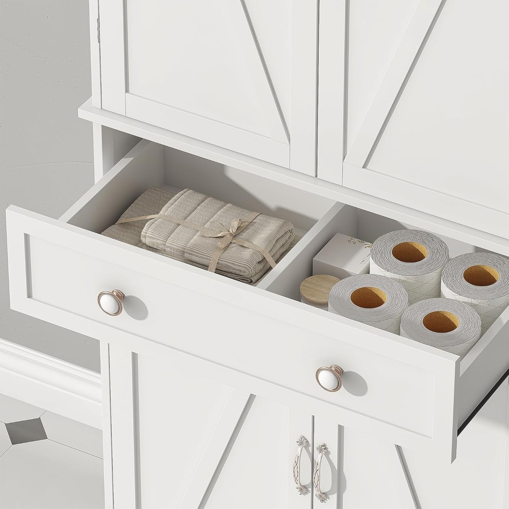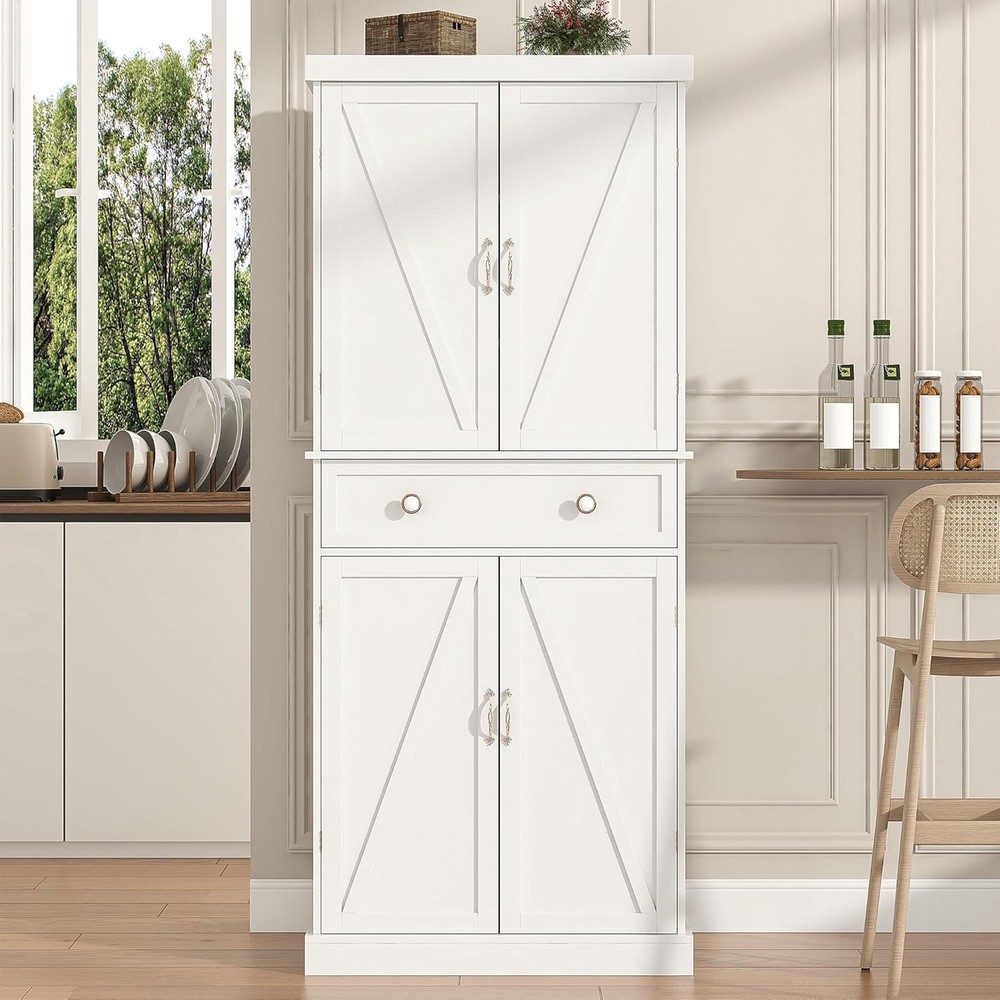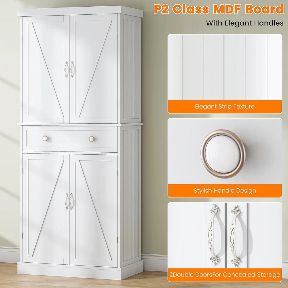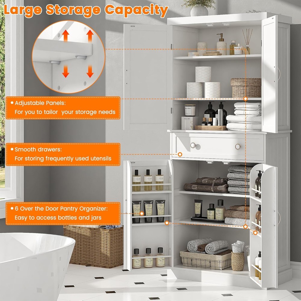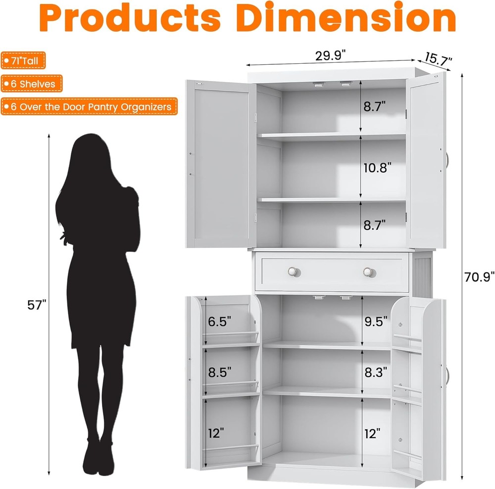 Product Description Kitchen pantry cabinet is made of high-quality engineered wood. Without fear of waters, it performs well in both kitchens and bathrooms. Measuring 30"W x 16"D x 72"H, the kitchen pantry features a drawer and multi-shelf design with 6 small shelves and 6 large shelves, 4 of which can be adjusted to suit your individual needs, suitable for storing household items, small appliances, Cookware and a variety of kitchen supplies to keep the kitchen clean and tidy. cares about the safety of our customers on using freestanding storage cabinet. And our pantry cabinets are all equipped with anti-tip kits to ensuring the safety of customers. About this item Spacious Storage Options: The 71" free standing food pantry equipped with a drawer, 6 shelves and 6 over the door organizer. This tall storage cabinet offers ample space to organize your essentials. Adjustable Panerls: Tailor your storage needs with 4 adjustable panels in our kitchen pantry cabinet. Whether you need more room for pantry items or laundry, this cabinet adapts to your lifestyle. Stable & Sturdy: Our pantry cabinet are crafted from sturdy engineered wood and premium hardware.This storage cabinet is designed for whole room, including Kitchen, guest room, living room. Vesalite Design: Jehiatek kitchen pantry cabinet is made of high-quality engineered wood. Without fear of waters, it performs well in both kitchens and bathrooms. Clear Instructions of Assembly:All parts are clearly numbered, and the step-by-step instructions are easy to follow. We thoroughly inspect all items before shipping to ensure quality. If you encounter any issues with kitchen pantry cabinet, please tell us, and we’ll resolve any problems for you. On Aug 12, 2025 at 02:39:26 PDT, seller added the following information: