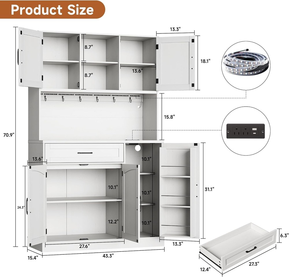 Product Description About this item 71“ TALL PANTRY WITH AMPLE STORAGE: Standing at a towering 71 inches, this kitchen cabinet offers vast storage to maximize your space. With multiple compartments, including cabinets, microwave shelf with 6 hooks, drawers, and door shelves, it’s perfect for organizing pantry items, kitchenware, and more, making it ideal for restaurant kitchens or large households. ADJUSTABLE LED LIGHTING & CONVENIENT POWER OUTLETS: Equipped with energy-efficient LED lights, this kitchen pantry storage cabinet illuminates your stored items clearly, even in low-light conditions. Stay powered up with built-in AC power outlets, a USB port, and a Type-C port. Whether you need to charge kitchen appliances, tablets for recipe viewing, this pantry cabinet keeps your devices within reach and ready to use. KITCHEN HUTCH WITH MICROWAVE SHELF & HOOKS: The cabinet features a dedicated microwave shelf, saving valuable counter space. Additionally, 6 sturdy hooks provide quick access to frequently used utensils like spatulas, ladles, or towels, keeping your workspace organized and efficient. DOOR SHELVES & ADJUSTABLE SHELVES: Tailor the storage to your needs with adjustable shelves and door racks. Whether you're storing tall bottles, bulky pots, or delicate spice jars, this kitchen pantry cabinet adapts effortlessly, ensuring every inch of space is optimized for your restaurant's unique requirements. MATERIAL SAFETY & DURABILITY: Crafted from top-tier, durable materials, this kitchen pantry cabinet is engineered for exceptional solidity, ensuring it withstands daily use with ease. For added safety, it includes wall connection fixers that allow you to securely attach the cabinet's back to the wall. This feature provides peace of mind, especially in high-traffic areas like restaurant kitchens or bustling households. EASE OF INSTALLATION: Assembly is a breeze with this kitchen pantry cabinet. All parts and accessories are conveniently numbered, and each installation step is accompanied by clear, detailed instructions. We prioritize your convenience and satisfaction, which is why we conduct thorough checks before delivery to ensure everything is in perfect order and ready for assembly. 71" Tall Kitchen Pantry Cabinet with LED Light & Outlet & Drawer Previous page Kitchen Hutch Cabinet Generous counter space fits various home appliances Spacious Countertop Features LED light, charging station, and 6 cup hooks Drawer & Door Shelf Deep drawer keep utensils in perfect order Next page Pantry Storage Cabinet with Microwave Shelf & 6 Hooks Previous page Charging Station Light Strip Next page Previous page Next page On Aug 14, 2025 at 20:05:44 PDT, seller added the following information: