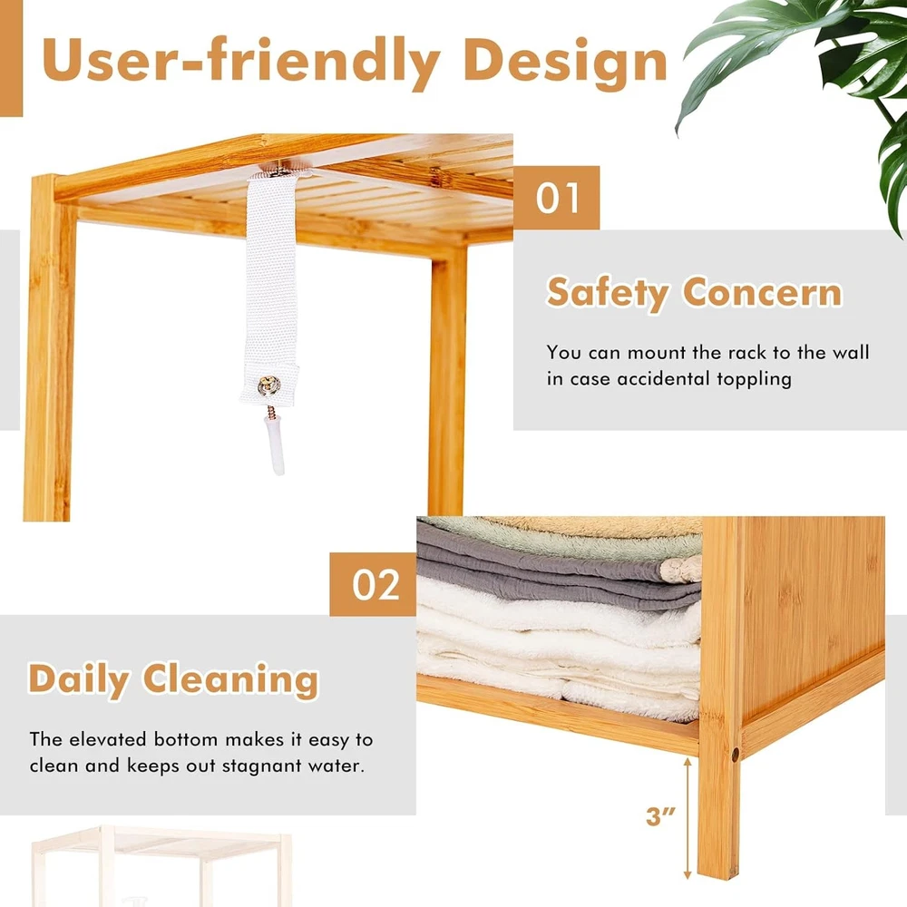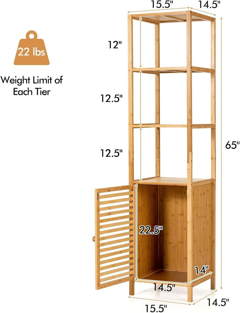 Tall Bamboo Cabinet, Narrow Bathroom Floor Storage Cabinet with 3 Tier Shelves & Shutter Door, Slim Linen Tower Cabinet for Living Room or Kitchen, 15.5 x 14.5 x 65 inches Product Description About this item Wise Storage Solution to Small space: This bamboo cabinet can be placed in any corner or gap, effectively saving floor space and maximizing the storage function of the room. Besides, the open shelf design offers easy access and make it convenient for you to organize your stuff. Premium Bamboo Construction: Constructed from natural bamboo, the bamboo storage cabinet is sturdy, and durable especially in bathroom environment. And the surface is smoothly polished for a fine touch. Besides, the overall shelf weighs only 16.5 lbs, so you can move it around with ease. Versatile Storage Unit for Any Room: Troubled by the messy room? This bamboo shelf will perform its magic and keep any room well organized. You can make it a bathroom floor cabinet to store towels and toiletries, use it to hold spices bottles and small household appliances in the kitchen, or display decorations in living room. User-friendly Design: To make the tall narrow cabinet a stable unit, we have specially added an anti-toppling device to prevent it from falling over. Meanwhile, the 4 raised feet can provide solid support and enhance overall structure. And the 3-inch clearance makes it easy to clean and keeps out stagnant water. Easy Assembly & Maintenance: The skinny bamboo cabinet is simply-structured and requires very few efforts on assembly. With easy-to-follow instructions and necessary accessories, you can quickly put it together without any problem. What’s more, the daily maintenance is a breeze, since the surface is smooth and the slatted design easily drains water.