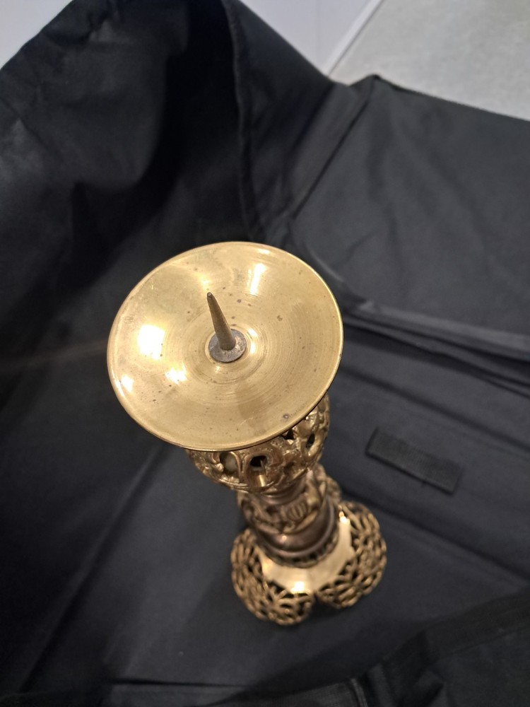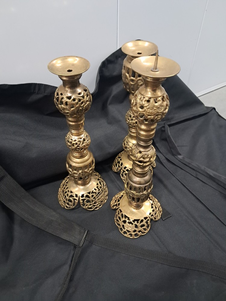 This set of two tall vintage brass candle holders features an Asian-inspired design with intricate filigree detailing. The adjustable height allows for versatility in placement, making them suitable for any room in the house. Standing at 15 inches tall, these candle holders are perfect for creating a warm and inviting atmosphere with a touch of vintage charm. Easy to clean with a damp cloth, these candle holders are a beautiful addition to any collection or decor.