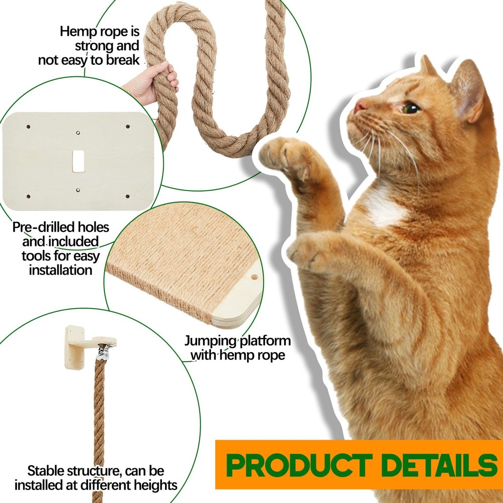 Features: Wall mounted cat tree provides your cats with lots of opportunities to climb, play, and exercise, promoting a good and active lifestyle. The cat climbing rope and shelves set can satisfy your cat's scratching needs while protecting your furniture from cat claws. Specifications: Material: solid wood, jute Color: wood Size: Total height: about 59.1 inches/ 1.5 m Cat platform: 7.48 x 4.45 inches/ 19 x 11.3 cm Package includes: 1 x Set of Cat tree with climbing rope 1 x English instruction manual Notes: Manual measurement, please allow slight errors on size. The color may exist a slight difference due to different screen displays. Small parts included, please keep them away from little kids to avoid swallowing risk. Dual Platform Design: it comes with 2 pieces of cat wall steps and a jute cat climbing rope, that allows cat to jump between levels, and provides a cozy space for it to relax and nap, ensuring they can recharge after playing Proper Size: the cat tower with climbing rope measures about 59.1 inches/ 1.5 m in total height, which satisfies cats' natural desire to stand in high places for a sense of security and climbing instinct, encouraging their active play and exploration, bringing them an interesting experience Sturdy and Durable: our wall cat rope scratching post set is made of quality solid wood and 1.97 inches/ 5 cm thick jute rope, which is strong and safe, not easy to break, it can bear the weight of most cats and help cats sharpen their claws and meet their scratching needs Easy to install: holes have been drilled in the wood of this wall climbing cat toy, and nails and instructions are prepared, you can just install it directly on the wall according to the steps and the heights you want Space Saving: the cat tree with climbing rope features wall mounted design for saving your floor space, it will offer a stable and secure climbing solution for small space or apartments, providing a vertical playground that maximizes your space