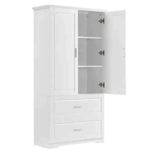 Tall White Bathroom Storage Cabinet with Doors & Drawers – Adjustable Shelf, MDF, Modern Freestanding Organizer free&fast shipping !!! Desctiption : Bring elegance and order to your space with this Tall White Storage Cabinet , crafted from durable painted MDF wood . Designed to suit bathrooms, kitchens, or even offices, this freestanding unit features two large drawers and a double-door cabinet with adjustable shelving —perfect for storing towels, toiletries, pantry items, or decorative pieces. ✅ Key Features: Sturdy & Elegant: Made of premium painted MDF with smooth, waterproof surfaces Spacious Design: Features 2 deep drawers and a 3-tier cabinet behind double doors Adjustable Shelf: Customize the internal layout to suit your needs Safe for Families: Includes an anti-toppling device for wall attachment Versatile Use: Ideal for bathroom, kitchen, laundry room, or living room Easy to Assemble: All tools and instructions included 📦 Product Specifications: Main Color: White Main Material: MDF (Medium-Density Fiberboard) Overall Dimensions: 32” L x 15” W x 63.2” H Drawer Inner Size: 31.3” W x 11.9” D x 7.1” H Shelf Weight Capacity: 45 lbs each Drawer Weight Capacity: 25 lbs each Net Weight: 72.75 lbs Assembly Required: Yes Certification: CARB P2 Compliant 📦 Package Includes: 1 × Tall Bathroom Cabinet 2 × Large Drawers (pre-cut panels) 2 × Cabinet Doors 3 × Interior Shelves (1 adjustable) 1 × Hardware Pack (screws, hinges, anti-tip kit) 1 × Step-by-Step Instruction Manual ✨ Whether you're upgrading a small bathroom or organizing a busy kitchen, this stylish and practical cabinet provides the perfect balance of beauty and functionality .