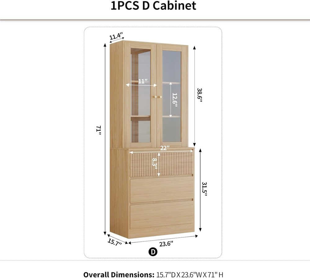 Wood Bookcase Cabinet, 71’’ Freestanding Tall Storage Cabinet with 2 Tempered Glass Doors, Modern Kitchen Cupboard Large Floor Cabinet for Kitchen, Living Room, Home Office (D) Product Description About this item 【SIMPLE DESIGN】The natural wood texture and vertical stripe decoration enhance the visual effect of the furniture, whether it is the living room, bedroom, dining room or study, it can be perfectly integrated into your home environment and enhance the practicality and aesthetics of the space. 【QUALITY MATERIAL】This bookcase is made of high quality MDF, ensuring its durability and reliability. The surface is smooth and easy to clean and maintain, just wipe it gently with a damp cloth to remove stains and keep the bookcase neat and beautiful. The top of the bookcase has an anti-tipping device, which can effectively enhance the stability of the bookcase and prevent it from accidentally tipping over during use. 【TEMPERED GLASS DOORS & SHELVES】Multi-tier design keeps clutter in its place, this bookcase has 3 shelves behind the upper cabinet door and 2 shelves behind the lower cabinet door. Toughened glass doors protect your belongings from dust and dirt, and documents and office items are easy to see, easy to access, and multiply your work efficiency. 【MULTIFUNCTIONAL BOOKCASE】The wood grain design is clear and natural, and the vertical stripe design gives the cabinet a unique texture, making it an ideal addition to all types of living spaces and storage areas. Whether it's for storing clothes, display items or other daily necessities, it can find its place as a storage cabinet in a study, home office, bedroom or living room or kitchen. 【ASSEMBLY NOTE】Please review the list of hardware/screws/planks in the instructions before assembling. Please follow the instructions step by step to assemble carefully, each part is labeled to prevent damage caused by violent installation. This versatile cabinet is practical and artistic, not only providing storage space, but also enhancing the quality of life. Designed with a wood-colored vertical stripe finish visually elongates the product, enhancing the sense of space and dimension. Simple and stylish, it adapts to a variety of home styles, including modern minimalist, Scandinavian and retro classical. It makes life more organized and adds warmth and harmony to the home.