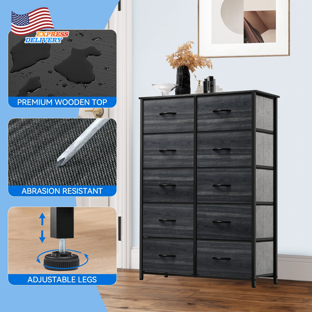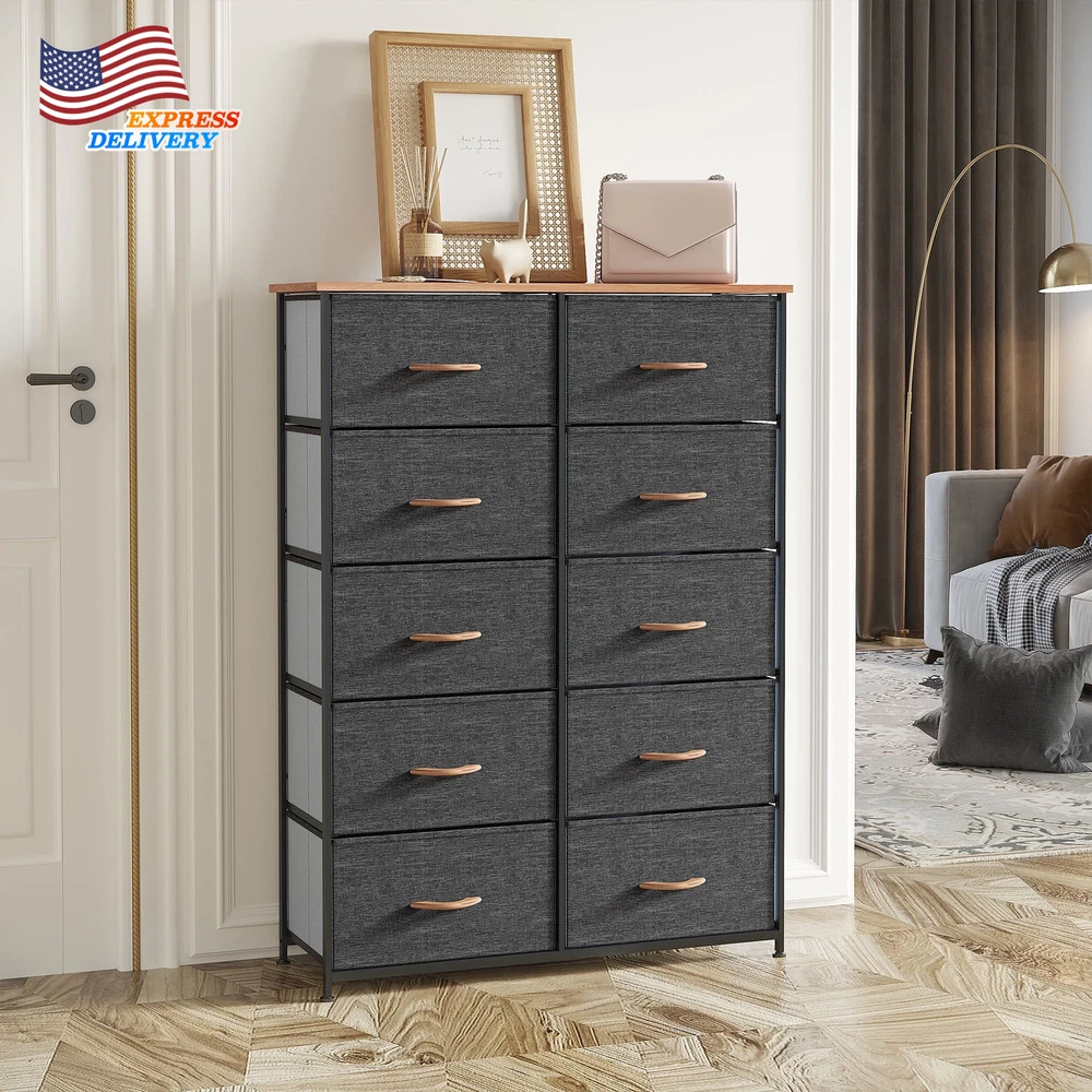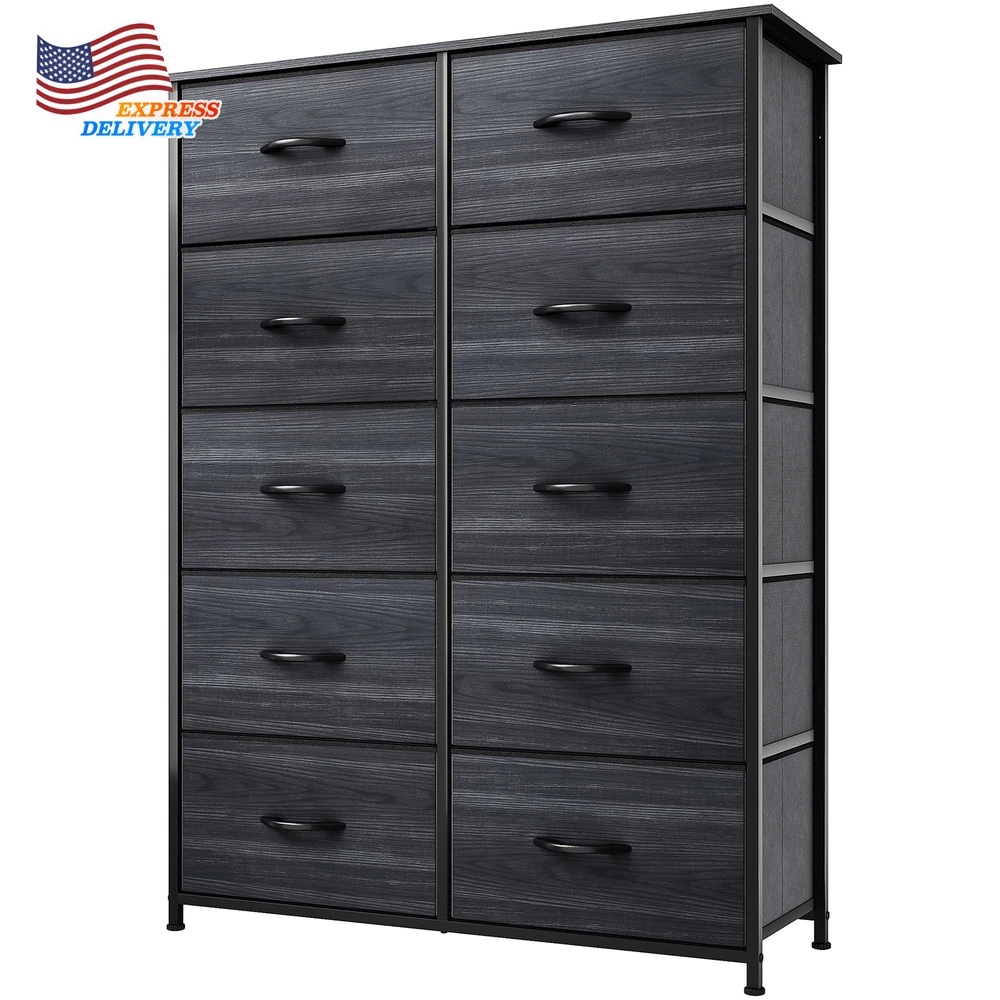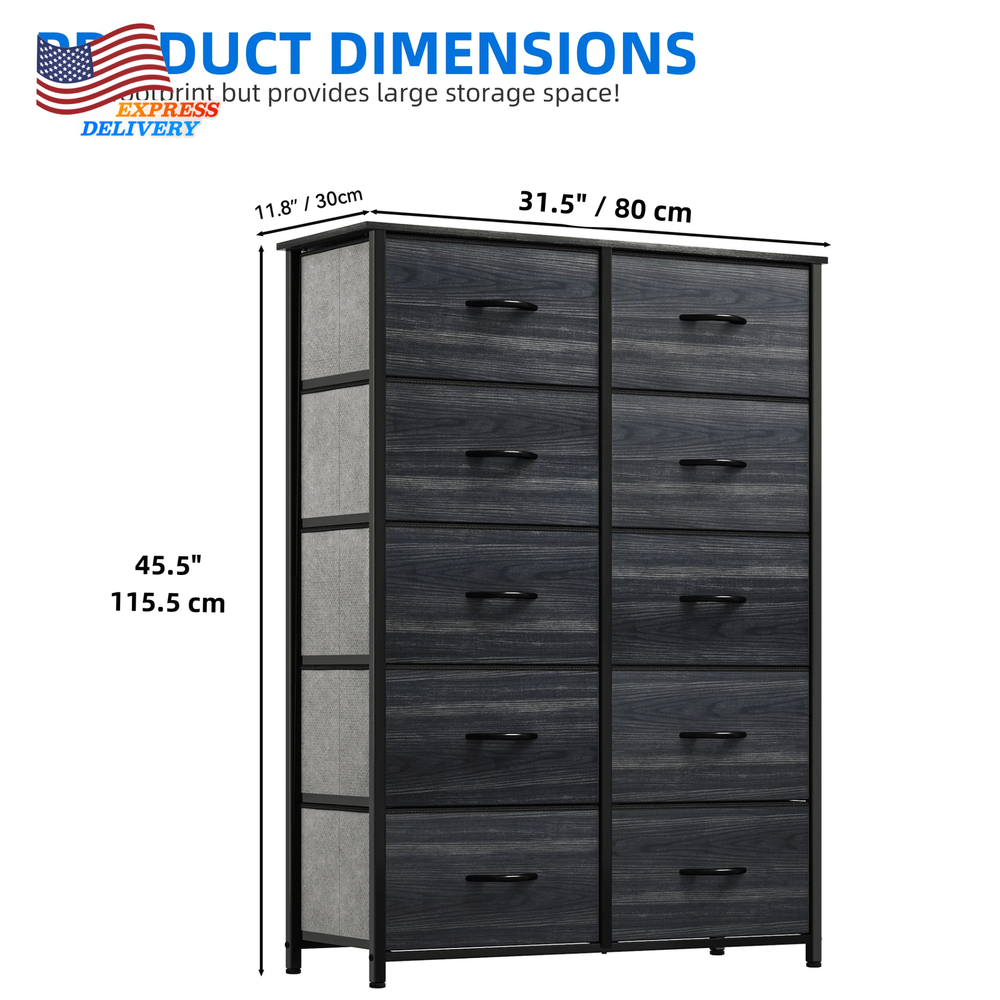 High-quality wooden boards, Wood top provides a hard surface to place cups, lamps, books and etc. Modern technology, suitable for most decoration styles; easy to assemble; maximum load: 70lbs. Screw-in leveling feet adjust easily on uneven ground and protect the floor from scratches.The Dextrus 10-Drawer dresser conveniently organizes your clothes, scarves, socks, T-shirts, pants, sunglasses, books, small toys, etc.; Overall dimensions: 33.9" L x 11.8" W x 47.2" H; Drawer dimensions: 15.6'' L x 11.0'' W x 8.5'' H.Fixing the fabric dresser to the wall is well recommended. Please follow the instructions. QUALITY CONSTRUCTION- Structured with a powerful metal frame and a durable MDF wooden top; Contains 10 removable drawers with easy-to-pull wooden handles; Held up by 4 adjustable plastic legs that prevent scratches to your floor; The innovative crossbar design on the back enhances product stability; The dresser can be secured to a wall with screws DURABLE FABRIC- The drawer's front side is constructed with premium cationic polyester fabric; The surrounding sides are covered by breathable, non-woven synthetic fabric; Allows for easy care - simply wipe clean with a damp cloth and let air dry EASY ASSEMBLY- Comes with detailed instructions for a hassle-free installation; All pieces and accessories are included in the package; Assembly only requires you to fasten a few screws VERSATILE COLOR SCHEME- Highlights a sleek, modern design combining premium charcoal fabric drawers, a sturdy black metal frame, and a wooden tabletop; Perfect for living rooms, bedrooms, hallways, entryways, closets, nurseries, etc. LARGE STORAGE CAPACITY- The Dextrus 10-Drawer dresser conveniently organizes your clothes, scarves, socks, T-shirts, pants, sunglasses, books, small toys, etc.; Overall dimensions: 33.9" L x 11.8" W x 47.2" H; Drawer dimensions: 15.6'' L x 11.0'' W x 8.5'' H Fixing the fabric dresser to the wall is well recommended. Please follow the instructions.