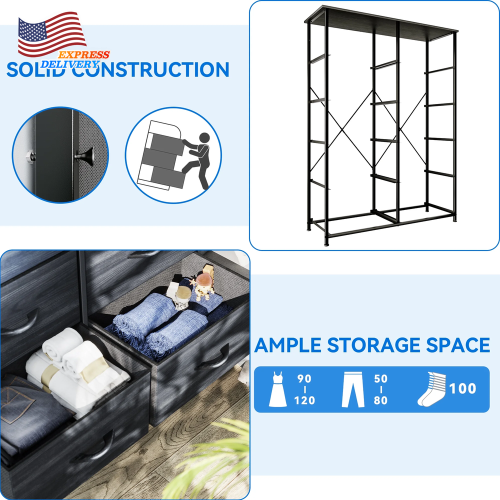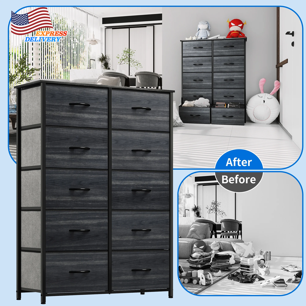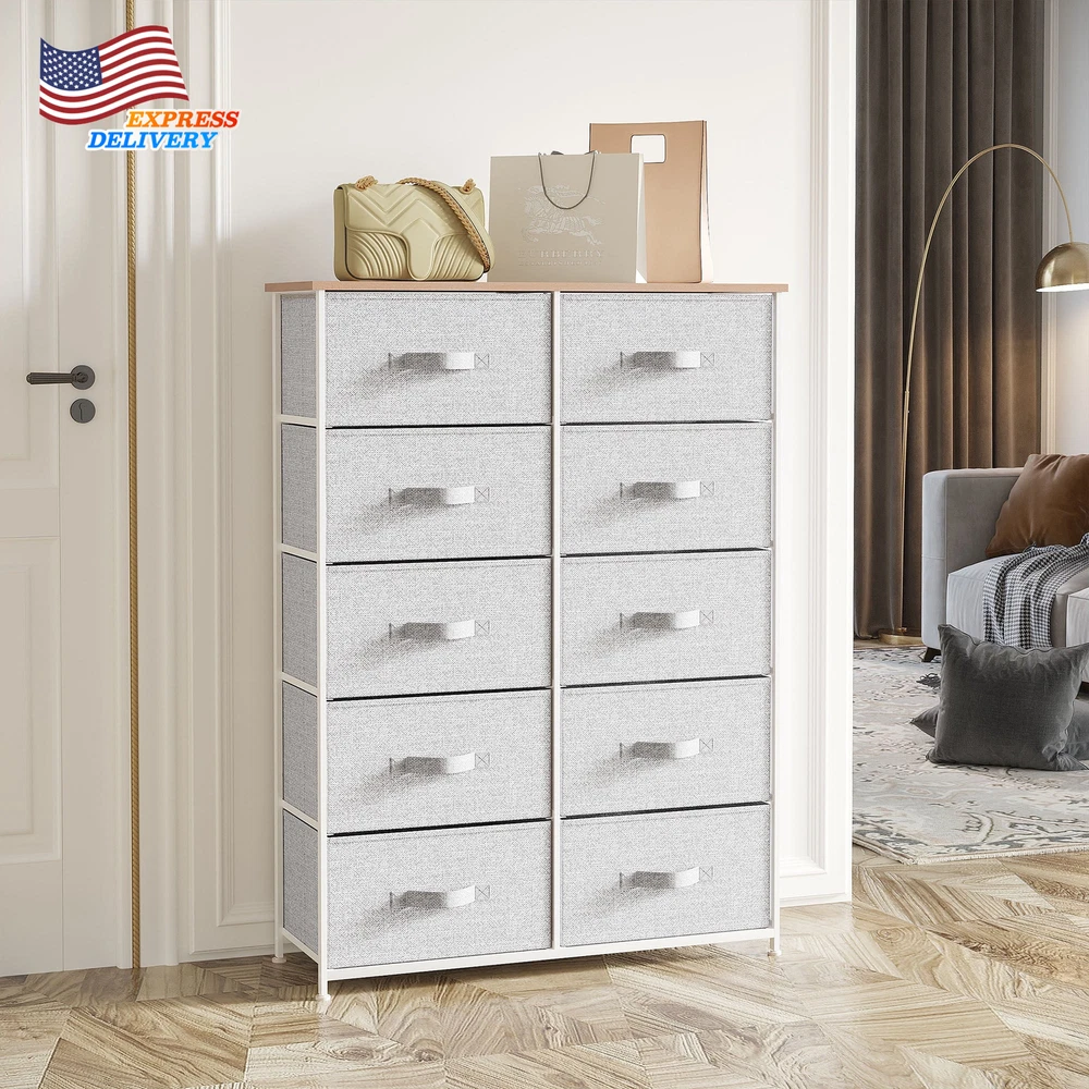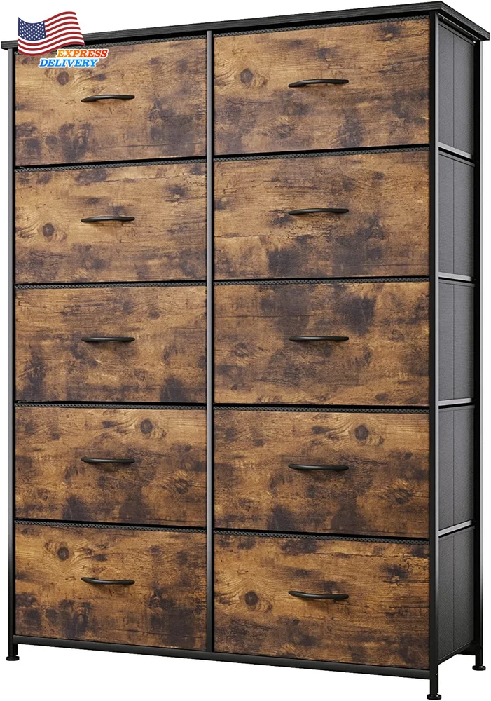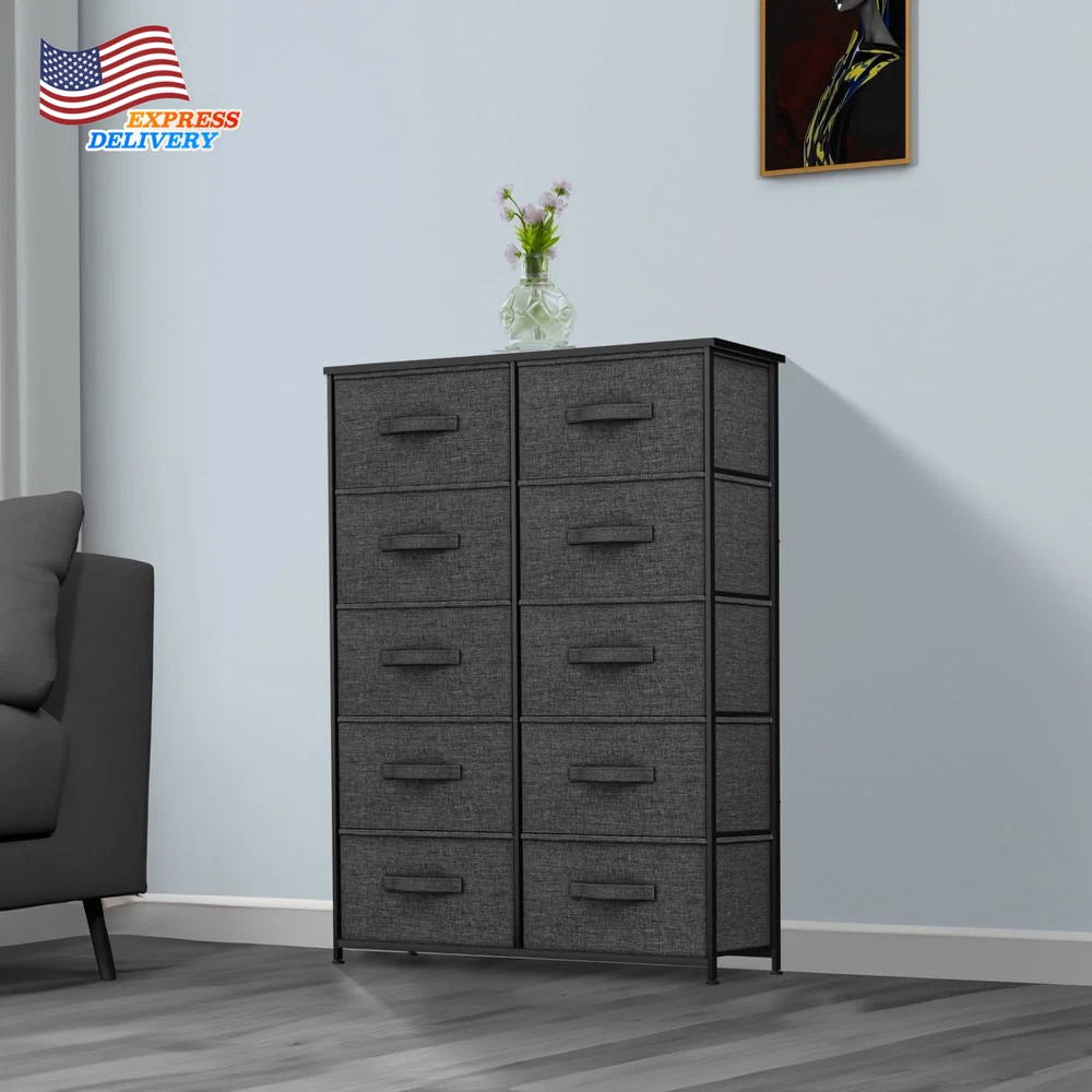 High-quality wooden boards, Wood top provides a hard surface to place cups, lamps, books and etc. Modern technology, suitable for most decoration styles; easy to assemble; maximum load: 70lbs. Screw-in leveling feet adjust easily on uneven ground and protect the floor from scratches.The Dextrus 10-Drawer dresser conveniently organizes your clothes, scarves, socks, T-shirts, pants, sunglasses, books, small toys, etc.; Overall dimensions: 33.9" L x 11.8" W x 47.2" H; Drawer dimensions: 15.6'' L x 11.0'' W x 8.5'' H.Fixing the fabric dresser to the wall is well recommended. Please follow the instructions. QUALITY CONSTRUCTION- Structured with a powerful metal frame and a durable MDF wooden top; Contains 10 removable drawers with easy-to-pull wooden handles; Held up by 4 adjustable plastic legs that prevent scratches to your floor; The innovative crossbar design on the back enhances product stability; The dresser can be secured to a wall with screws DURABLE FABRIC- The drawer's front side is constructed with premium cationic polyester fabric; The surrounding sides are covered by breathable, non-woven synthetic fabric; Allows for easy care - simply wipe clean with a damp cloth and let air dry EASY ASSEMBLY- Comes with detailed instructions for a hassle-free installation; All pieces and accessories are included in the package; Assembly only requires you to fasten a few screws VERSATILE COLOR SCHEME- Highlights a sleek, modern design combining premium charcoal fabric drawers, a sturdy black metal frame, and a wooden tabletop; Perfect for living rooms, bedrooms, hallways, entryways, closets, nurseries, etc. LARGE STORAGE CAPACITY- The Dextrus 10-Drawer dresser conveniently organizes your clothes, scarves, socks, T-shirts, pants, sunglasses, books, small toys, etc.; Overall dimensions: 33.9" L x 11.8" W x 47.2" H; Drawer dimensions: 15.6'' L x 11.0'' W x 8.5'' H Fixing the fabric dresser to the wall is well recommended. Please follow the instructions.