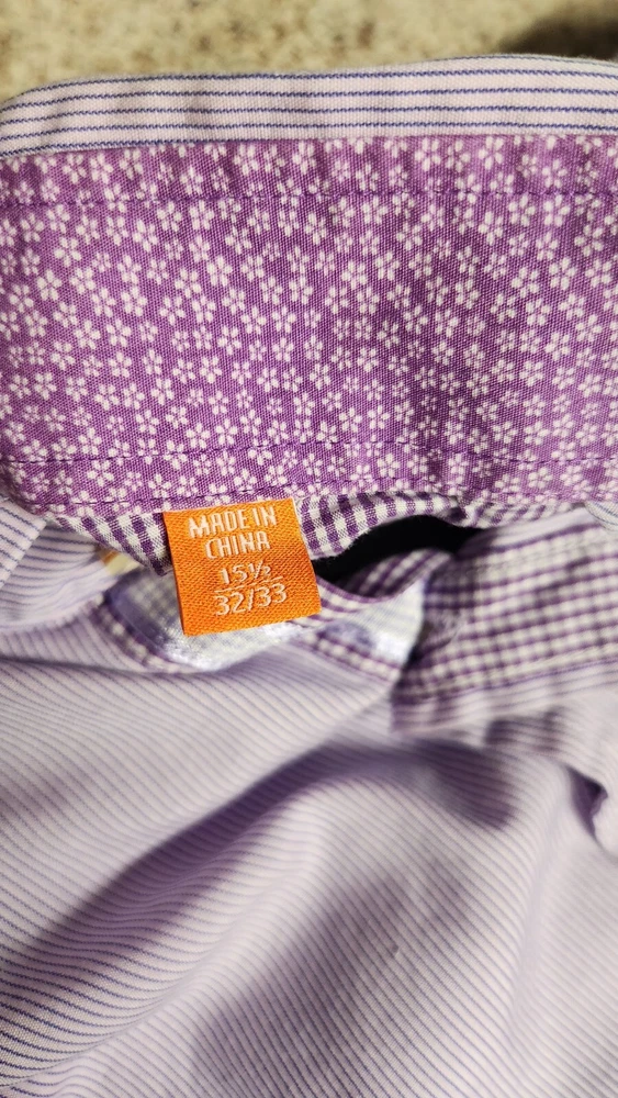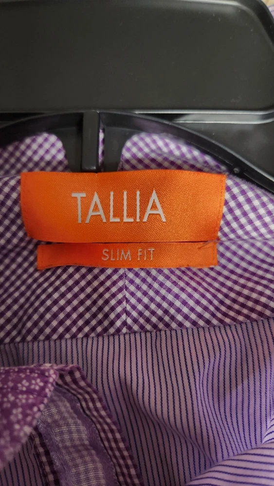 Material: 97% Cotton, 3% Spandex UPC: 069124453239 Fabric Wash: Medium Vintage: No Chest Size: 42 in Closure: Button Size Type: Regular Brand: Tallia Pattern: Striped Occasion: Business, Casual Shirt Length: 29 in Fit: Slim Fit Top Cuff Style: Standard Cuff Size: M Collar: Spread Sleeve Length: Long Sleeve Garment Care: Machine Washable Color: Purple Handmade: No Department: Men Accents: Button gtin13: 069124453239 Neck Size: 15.5 in Features: Slimming Type: Dress Shirt