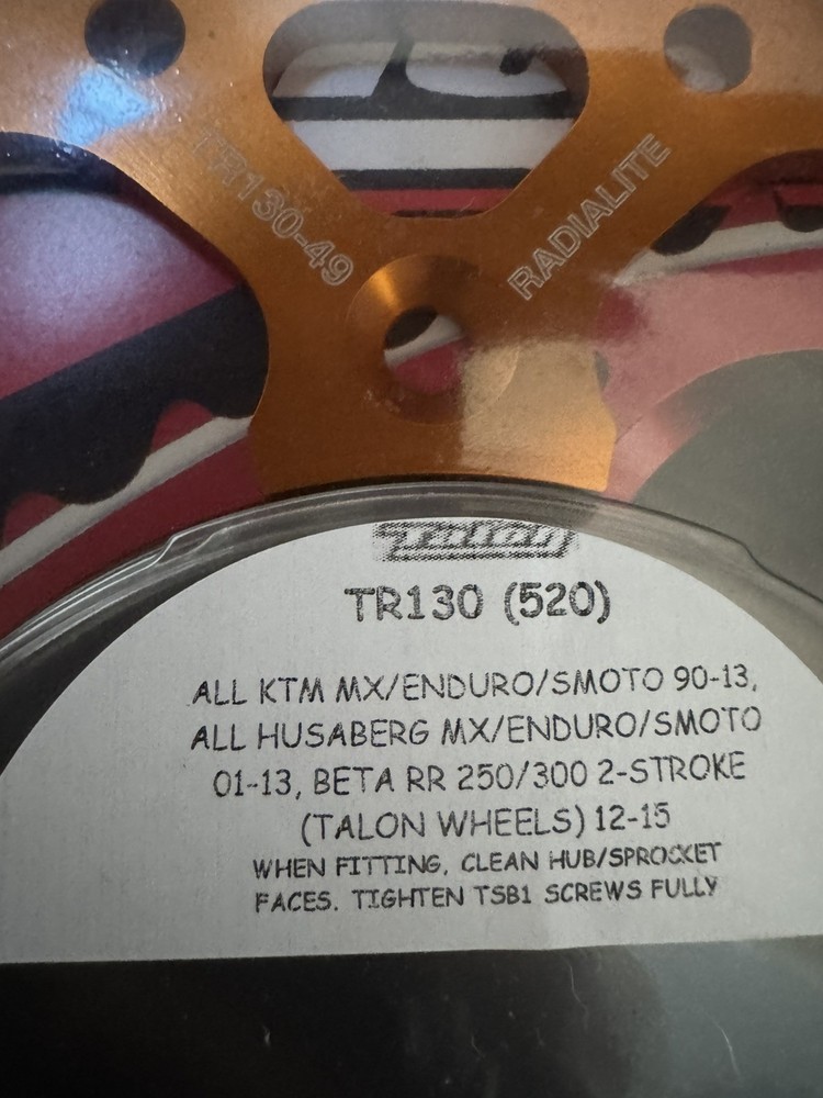 Orange Radialite Rear Sprocket 520 pitch 49 tooth, (TR130-49) orange anodized finish. • CNC-machined from 7075-T6 ✨aerospace-grade aluminium✨ • a lightweight Radialite design • with a self-cleaning radial groove • designed to expel mud. ✅ Fitment: KTM • 125 SX 1990-2025 • 125 EXC 1990-2016 • 125 XC-W 2017-2019 • 144 SX 2008 • 150 SX 2009-2025 • 150 XC-W 2017-2019 • 150 EXC Tpi 2020-2024 • 200 SX 2003-2005 • 200 EXC 1998-2016 • 250 SX 1990-2025 • 250 EXC 1990-2017 • 250 EXC Tpi 2018-2024 • 250 SX-F 2006-2025 • 250 EXC-F 2007-2024 • 300 SX 2023-2025 • 300 EXC 1990-2017 • 300 EXC Tpi 2018-2024 • 350 SX-F 2011-2025 • 350 EXC-F 2012-2024 • 360 SX 1996-1997 • 360 EXC 1996-1997 • 380 SX 1998-2002 • 380 EXC 1998-2002 • 400 SX 2000-2002 • 400 EXC 2000-2002 • 400 EXC-R 2009-2011 • 450 SX 2003-2006 • 450 EXC 2003-2007 • 450 SM-R 2004-2014 • 450 SMR 2021-2024 • 450 SX-F 2007-2025 • 450 EXC-R 2008-2011 • 450 EXC 2012-2024 • 500 EXC 2012-2024 • 505 SX-F 2008 • 505 XC-F 2009 • 520 SX 2000-2002 • 520 EXC 2000-2002 • 525 SX 2003-2006 • 525 EXC 2003-2007 • 525 SM-R 2004-2005 • 530 EXC-R 2008-2011 • 560 SM-R 2006-2007 • 600 LC4 1988-1990 • 620 LC4 1997-2002 • 640 LC4 1998-2007 • 690 Enduro/R 2008-2012 • 690 Supermoto 2007-2009 • 690 SMC 2008-2012 Husqvarna • TC 125 2014-2025 • TE 125 2014-2016 • TX 125 2017-2019 • TE 150 2017-2019 • TE 150 i 2020-2024 • TC 250 2-Stroke 2014-2025 • TE 250 2014-2017 • TE 250 i 2018-2024 • FC 250 2014-2024 • FE 250 2014-2024 • TC 300 2025 • TE 300 2014-2017 • TE 300 i 2018-2024 • TX 300 2017-2019 • TX 300 i 2020-2025 • FC 350 2014-2024 • FE 350 2014-2024 • FX 350 2017-2025 • FC 450 2014-2025 • FE 450 2014-2024 • FX 450 2017-2025 • FS 450 2015-2024 • FE 501 2014-2024 Gas Gas • MC 125 2021-2025 • MC 150 2025 • MC 250 2022-2025 • MC 250 F 2021-2025 • EC 250 2021-2024 • EC 250 F 2021-2024 • EX 250 2022-2025 • EX 250 F 2021-2024 • EC 300 2021-2024 • EX 300 2021-2025 • MC 350 F 2023-2025 • EC 350 F 2021-2024 • EX 350 F 2021-2024 • MC 450 F 2021-2025 • EX 450 F 2021-2024 • EC 500 F 2024 Other • Stark Varg 2023-2024 • Triumph TF 250-X 2024 Notes • Talon Radialite rear sprocket • Chain size: 520