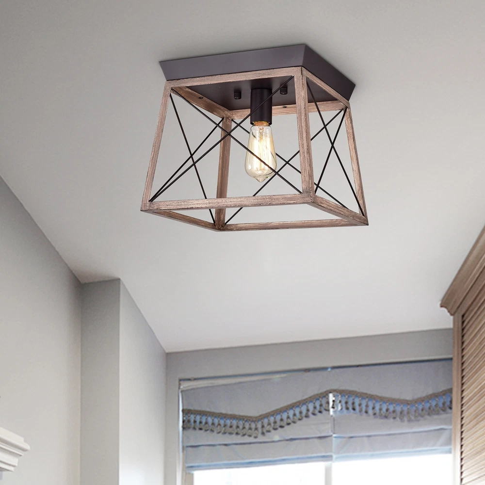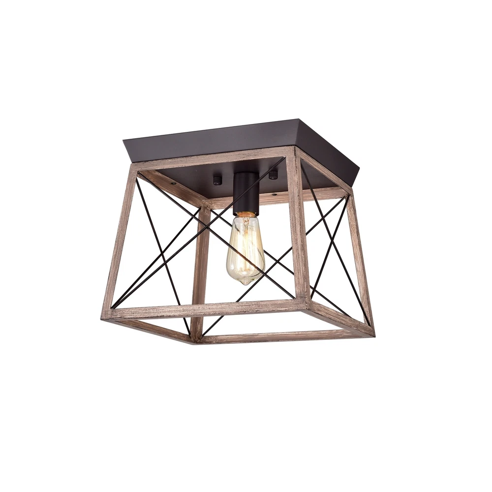 Description:This 1-light metal cage flush mount is an eye-catcher. The farmhouse-inspired light fixture features an open-cage frame composed of faux-wood with a brown oak finish. An X-brace design recalls old barn doors and farmhouse gates as it stretches across each side of the frame. The exposed bulb allow for maximum light flow to illuminate any room.Features:Lighting Type: Flush MountFixture Finish: Imitation Wood Grain+Oil Rubbed BronzeShade Material: MetalSetting: IndoorNumber of Lights: One (1)Bulb Type: (1) E26 60W (not included)HardwiredDimensions:Overall: L 12 x W 12 x H 10.3 inchesFixture: L 12 x W 12 x H 10.3 inches Free Shipping Over $49.99* Details Tamara Oil Rubbed Bronze 1-Light Open-Cage Metal Flush Mount Product Description: Description: This 1-light metal cage flush mount is an eye-catcher. The farmhouse-inspired light fixture features an open-cage frame composed of faux-wood with a brown oak finish. An X-brace design recalls old barn doors and farmhouse gates as it stretches across each side of the frame. The exposed bulb allow for maximum light flow to illuminate any room. Features: Lighting TypeFlush Mount Fixture FinishImitation Wood Grain+Oil Rubbed Bronze Shade MaterialMetal SettingIndoor Number of LightsOne (1) Bulb Type(1) E26 60W (not included) Hardwired Dimensions: OverallL 12 x W 12 x H 10.3 inches FixtureL 12 x W 12 x H 10.3 inches