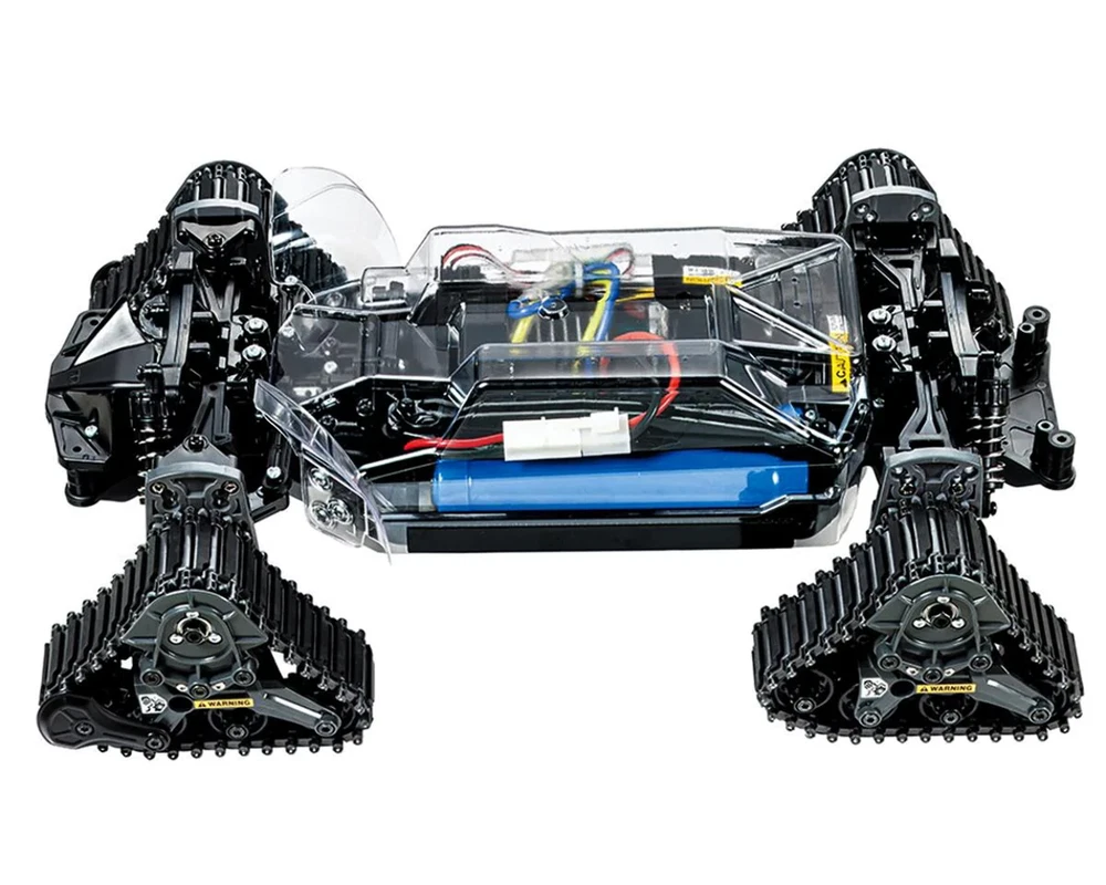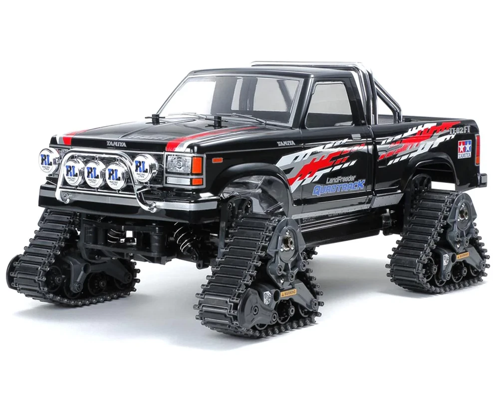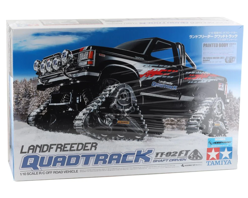 The Tamiya Landfreeder Quadtrack is a unique twist in the world of Tamiya trucks. This kit uses a variant of the TT-02 chassis with three-sided track units instead of wheels. The result is awesome traction that can be used to take on any terrain! The polycarbonate truck body comes out of the box pre-painted in Tamiya PS-5 black, with smoke PS-31 painted windows to eliminate the need for paint. Features: 1/10 scale R/C model assembly kit The Landfreeder body comes molded in polycarbonate, pre-painted Black (PS-5) and with Smoke (PS-31) painted windows Separate plated parts recreate grille cover, fog lamps and roll bar The TT-02FT is a variant of the TT-02 chassis, with four tracks on its suspension Each of the three-sided track units is 39.3mm in width and has a contact area of 60mm length Tracks require assembly from link parts, and offer efficient traction Two types of elastomer track link (standard and grouser) are included for setup options Track units are attached to suspension arms via plates, and each features a sprocket and four rollers The third roller is sprung to further enhance performance Polycarbonate chassis cover and wheel well liners give protection from dust and dirt encountered during off-road driving TT-02 four-bevel differentials and identical suspension arms are used Includes 540-brushed type motor Includes HobbyWing THW 1060 Brushed Motor ESC Specifications: Length: Â 425 Width: Â 247mm Adjustable Gear Ratio: Â Yes Bearings: Â Plastic bushing Body Material: Â Polycarbonate pre-painted body Body Stickers: Â Included Chassis Material: Â ABS Plastic Chassis Type: Â TT02FT Construction Type: Â Assembly Kit Differential Type: Â Gear Drive Type: Â 4WD Motor: Â 540-brushed type Scale: Â 1/10 Terrain Use: Â Multi-Purpose Needed to Complete: 2-channel radio Servo ESC 7.4V battery & compatible battery charger