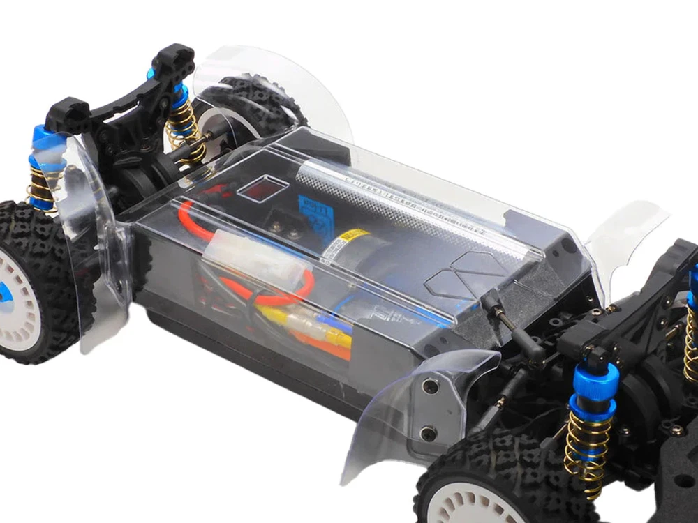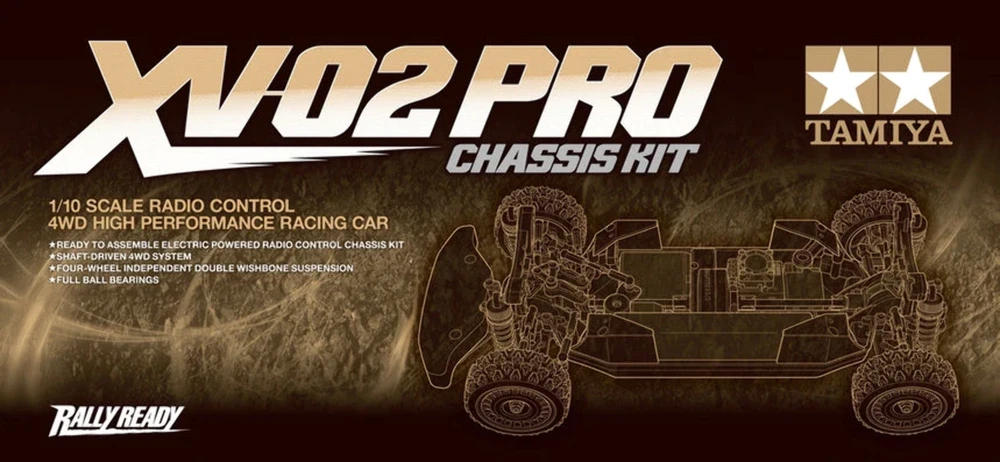 This is the Tamiya XV-02 Pro Chassis 4wd Rally Kit. Designed as an all out 4WD rally machine the XV-02 uses durable shaft driven drivetrain and a mid motor location. This results in the front and rear driveshafts to be equal lengths giving a true 50/50 torque split. Adding to the adjustments Tamiya has given you two different differential gear options. These give you the ability to over-drive or under-drive the front or rear differential catering the handling to your liking. Helping to control this power are the long aluminum shocks giving the XV-02 an abundance of plush suspension travel. Tamiya has packed this vehicle with tons of features designed to give you the ultimate driving experience. With a ground up rally design the XV-02 is ready to handle everything from tarmac to dirt. NOTE: Â Complete vehicle shown in photos for illustrative purposes only. This model is a kit requiring assembly and additional items. See Needed To Complete list above for full list of items required to complete the model. Features : Updated metal parts include motor mount, propeller shafts, input and center shafts, along with urethane bumpers. Longitudinal battery pack position in the center-left for optimum balance Long aluminum dampers are employed at front and rear. A polycarbonate chassis cover with wheel well liners help prevent dirt and dust from getting inside. Suspension arms and front uprights are based upon the XV-01 chassis kit. Specifications : Chassis Length : 368mm (excluding body) Chassis Width : 180mm Wheel Base : 257mm Frame : Bathtub type Drive System : Front midship motor / shaft drive 4WD Diff Gear : oil-filled gear differential for both front and rear Steering : 3-split tie rod type Suspension : 4-wheel double wishbone Shocks : Aluminum body long oil damper Gear Ratio : 9.58:1 when using the 19T pinion included in the kit (10.71:1 to 6.28:1 in combination with the separately sold pinions (Up to 14 types of gear ratios can be selected) Needed to Complete : Body 2-channel Radio System Steering Servo ESC 540-Type Motor 7.2-7.4volt Battery Compatible Charger