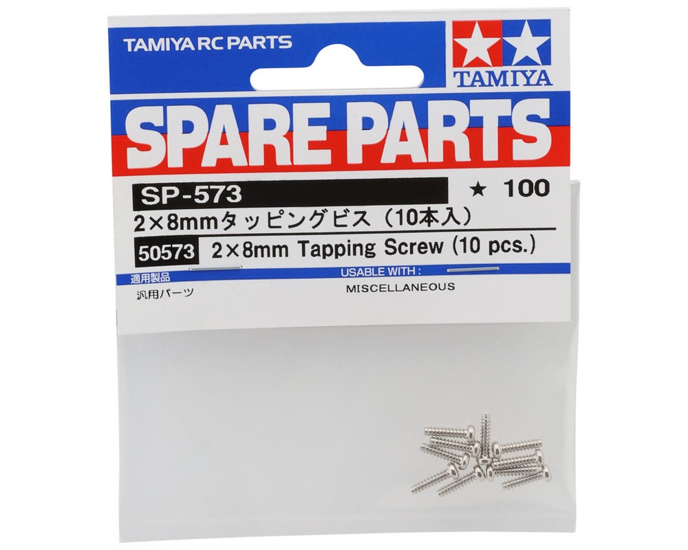 Screw Overview: Tamiya 2x8mm Self Tapping Screw. This is a replacement package of 2x8mm screws intended for a wide range of Tamiya chassis. Includes: (10) 2x8mm Self Tapping Screw About Us | View Store