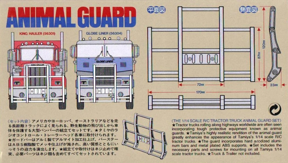 Tamiya brand Bull Bar (also called Tractor Truck Animal Guard) to suit a Tamiya 1:14th scale RC Tractor Trailer- Semi Trailer like King Hauler, Globeliner etc Description This is RC Tractor Truck Animal Guard – Bull Bar Feature: For: Tractor Truck Material: Aluminium & Delrin Colour: Silver Qty: 1Set Tractor trucks rolling along highways worldwide are often seen incorporating tough protective equipment known as animal guards-bull bars.. Tamiya’s highly realistic rendition of the animal guard greatly enhances the appearance of Tamiya’s 1/14 scale R/C tractor trucks. The guard incorporates hard anodized aluminium bars and metal plated ABS supports. Set includes the necessary parts and screws for mounting on all Tamiya 1/14 scale tractor trucks. Truck & Trailer not included. Item is new in original Tamiya packing. Part # 56506 Check out other great bargains in my E b a Y store , including more Tamiya 1:14 Semi Trailer parts. I am not a "drop shipper", all products are in stock in Australia being sold by an Australian seller. POSTAGE - AUSTRALIAN CUSTOMERS . If you want to use the Express Post service please buy one item and select Express post, then buy any other items you want with regular post (the default option). All items will be sent together via Express Post service……… INTERNATIONAL CUSTOMERS. For post quotes for multi item orders please message me. Thanks. All duties and taxes (if applicable) are the responsibility of the buyer. If you have any questions or special requests regarding this please feel free to message me. Manufacturers are constantly improving products and changes are made without prior notice. This means that changes can be made to products (including slight colour changes) from time to time. These changes in no way constitute any intent to change the basic description of an item, nor do they constitute a reason for an items return or warranty replacement. Return Policy: Any returns will be handled as per Ebay’s return policy. Returned items must be new, unopened and undamaged. Opened returns will attract a 50% “reduced value” fee. Any unrecoverable costs and fees incurred (by me) will be deducted from any refund issued. Warranty: items have a 30 day warranty, except drift wheels – which is ‘dead on arrival’ only. Warranty doesn’t cover crash damage, poor maintenance, misuse or incorrect assembly. Warranty covers sold items only.