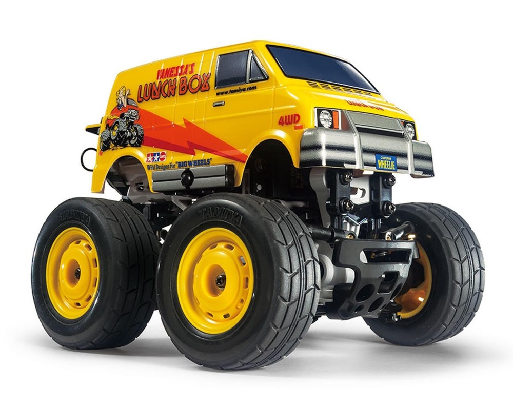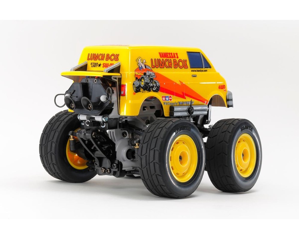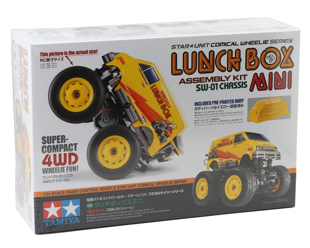 The Tamiya Lunch Box Mini 1/24 Mini Kit takes the classic Lunch Box body and shrinks it down to fit on top of the 4WD SW-01 chassis. It is capable of 4-wheel steering using separately sold Upper Arm Connectors that not only allows you to steer with all four wheels on the ground, but it also allows the vehicle to steer while doing wheelies! NOTE: Finished kit shown in photos is for illustrative purposes only. This is a kit that requires assembly. See needed to complete list below for a list of items required to complete the model. Features: The steering uses 1-piece upper arms for a tight turning circle and the body leans to help suppress tumbles It can be converted into a 4-wheel steering setup with TAM54898 SW-01 Upper Arm Connectors (not included) The body is attached to the body mounts using magnets for quick attachment The included Type 370 motor is located right in the center of the SW-01 chassis, in a gear-driven 4WD setup with a gear ratio of 21.875:1 1/24 scale R/C model assembly kit The famous Lunch Box body is molded in lightweight and durable polycarbonate and is pre-painted The body leans in the direction in which the model steers, achieving remarkably tight turning circles Responsive 4WD Strut style suspension Can be used with standard size servos and R/C equipment despite its compact nature Big, tread patterned tires give superb traction and add to the overall cartoonish look of the Lunchbox Mini Dish type wheels Compatible with Tamiya LF Battery LF1100-6.6V Racing Pack (M-Size) as a power source Specifications: Length: 190mm Width: 146mm Height: 140mm Needed to Complete: 2-Channel Radio Standard size servo Brushed ESC 7.2-7.4v battery pack (Battery pack size must be less than 66x36x15mm) Compatible charger About Us | View Store