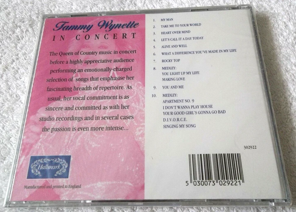 Tammy Wynette - In Concert, Live Recording, UK CD Album 1995, Hallmark Records, 302922. Brand new and factory sealed. Tracklist 1. My Man 2:54 2. Take Me To Your World 2:26 3. Heart Over Mind 2:17 4. Let's Call It A Day Today 3:30 5. Alive And Well 3:22 6. What A Difference You've Made In My Life 1:28 7. Rocky Top 2:01 Medley 2:25 8a. You Light Up My Life 8b. Making Love 9. You And Me 3:37 Medley 9:38 10a. Apartment No. 9 10b. I Don't Wanna Play House 10c. Your Good Girl's Gonna Go Bad 10d. D.I.V.O.R.C.E. 10e. Singing My Song Hello, many thanks for looking in at my listings. I would be happy to combine postage costs if more than one item is bought. Anything else you need help with please feel free to message me through eBay. Happy bidding