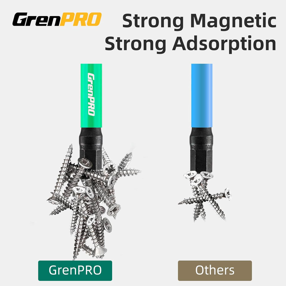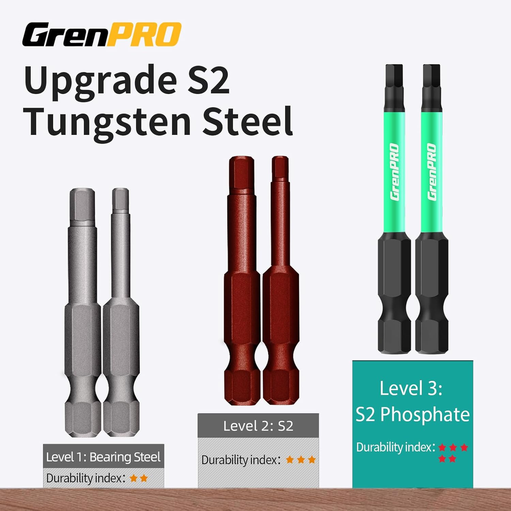 Make Life Long:GrenPRO impact security torx bit set 2 ” T20 25 pcs with Box. Torsion zone to absorb torque peaks to avoid breakage. 10 times life expectancy versus standard bits. For impact driver, drill and screwdriver High-Quality Materials:CNC machined tips, S2 alloy steel body, hardened core to increase bit strength and reduce fracture. Special coating to protect the surface, rust-proof ability; Upgrade the green protective cover, double the anti-rust effect High precision and magnetism:Strengthened magnetic impact torx bits magnetic and high precision. Helps you easy pick up screws. The magnetism doesn’t decay after multiple uses,no damage to the screw and screwdriver head Widely used:2 ” tamper proof torx bits 25 pcs (t20) Widely used in home repairs, automobiles, woodworking and other screw driving applications After-sales and service:Please contact us, we are willing to serve you attentively Product Description GrenPRO Impact Torx Bit Set The video showcases the product in use. The video guides you through product setup. The video compares multiple products. The video shows the product being unpacked. Features&Applications 1 Torsion Zone 2 S2 Alloy Steel 3 CNC Machined Tip 4 Phosphating Surface 5 Torx&Security Torx 1 Tools 2 Bike 3 Automotive 4 Woodworking GrenPRO Impact Bit Set Add to Cart Add to Cart Add to Cart Add to Cart Customer Reviews 4.6 out of 5 stars 189 4.6 out of 5 stars 189 4.9 out of 5 stars 28 4.6 out of 5 stars 191 4.6 out of 5 stars 191 Price $12.99 $ 12 . 99 — $16.99 $ 16 . 99 $11.99 $ 11 . 99 $8.99 $ 8 . 99 Material S2 Alloy steel S2 Alloy steel S2 Alloy steel S2 Alloy steel S2 Alloy steel Drive System Torx Torx Torx Hex Hex Number of Pieces 27pcs 13pcs 14pcs 20pcs 10pcs Size T7-T40 T7-T40 T7-T40 1.5-8,5/64-5/16 1.5-8 Length 1,2,3 inch 2 inch 3 inch 2 inch 2 inch Magnetic ✔ ✔ ✔ ✔ ✔ Impact resistance ✔ ✔ ✔ ✔ ✔