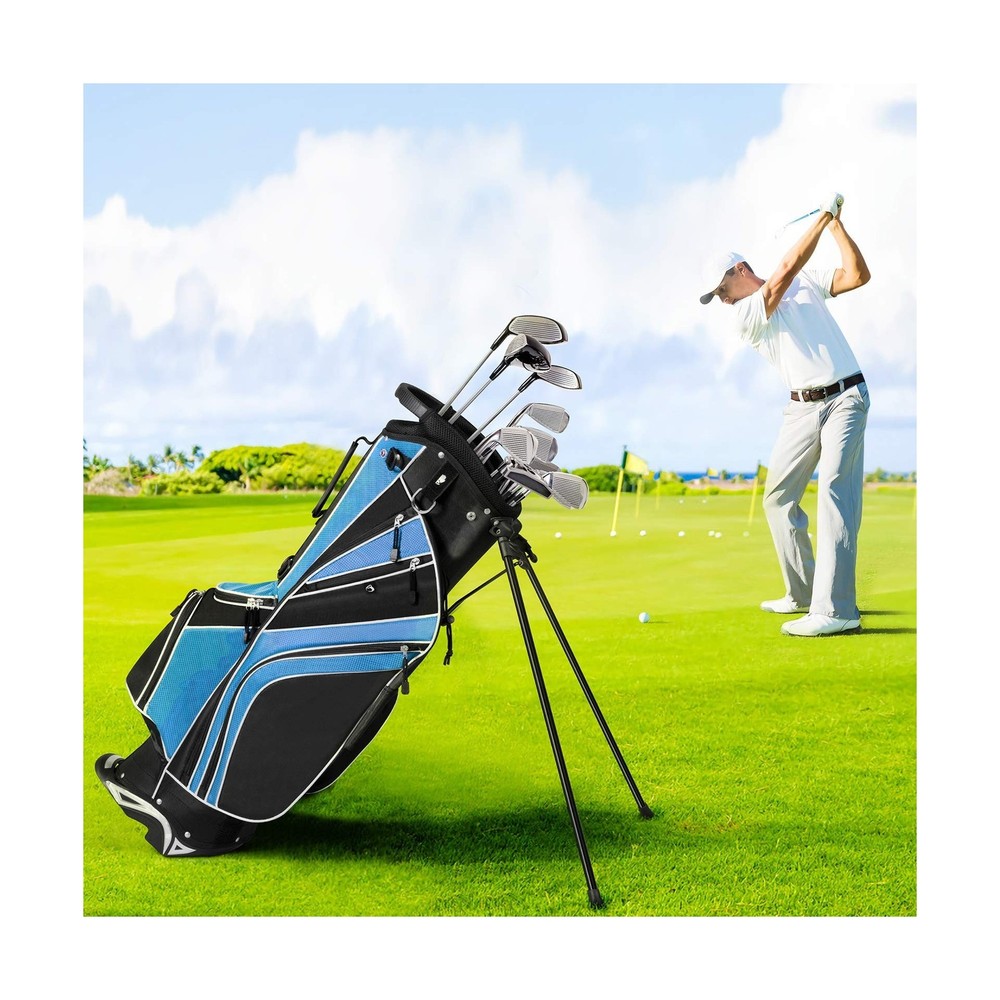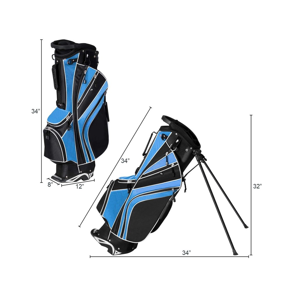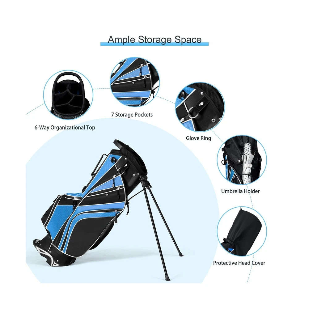 Tangkula Golf Stand Bag with 6 Way Top Dividers, Lightweight Golf Bag with Adjustable Dual Strap & 8 Pockets, Waterproof Rain Hood, Portable for Men Women Description Features: Water Resistance: Made of sturdy material, our golf bag is water resistance to avoid any liquid to permeate. And its sturdiness can well up to the additional wear and tear while using it. It surely guarantees you a durable lifetime for its sturdy construction. Reasonable Capacity: Featuring light weight of only 6 lbs and portability, golf bags 6 way dividers surprisingly offers you enough space to accommodate your golf clubs. There are 8 pockets on this bag to bring you additional storage space, which you can put various accessories in. Considerate Added Values: Backpack-style shoulder strap for extra comfort provides you a convenient handle on the side to quickly carry and go. And the special zipper design adds both practicability and aesthetics to this product. Specially designed umbrella holder offers you a good assistance. Premium Travel Helper: golf travel bag is quite great for traveling for it takes up very little space in a trailer, camper, or car trunk due to its compact body. You can just take it to your desired place effortlessly. And the bag can be stored neatly when you do not use it. Foot Support: With a mixed color and durable automatic stand with anti-slip foot, it can stand steadily and balanced as you want to release your hands. And it can also stand straight with a plastic chassis. A rubber foot pipe bracket can well prevent the scratch. Product Details: Brand: Tangkula Color: Blue Material: Polyester Strap Type: Adjustable Product Dimensions: 11"L x 8"W x 32.5"H Number of Dividers: 6 Item Weight: 6 Pounds Number Of Pockets: 8 Manufacturer: Tangkula Golf Club Bag Type: Stand Golf Bag Brand: Tangkula Color: Blue Material: Polyester Strap Type: Adjustable Product Dimensions: 11"L x 8"W x 32.5"H Number of Dividers: 6 Item Weight: 6 Pounds Number Of Pockets: 8 Manufacturer: Tangkula Golf Club Bag Type: Stand Golf Bag Item Package Dimensions L x W x H: 35.25 x 13.25 x 10 inches Package Weight: 3.38 Kilograms Item Dimensions LxWxH: 11 x 8 x 32.5 inches Brand Name: Tangkula Warranty Description: / Model Name: AM0047SP Suggested Users: unisex-adult Part Number: AM0047SP Included Components: 1 x Golf Stand Ba,g 1 x Rain Hood Date First Available: October 14, 2016 Delivery We Do Not Ship Outside of the Continental US. Return Policy All items qualify for returns within 30 days of receipt. Buyer is responsible for return shipping on any item that is not damaged. Feedback We take our reputation seriously, we buy and sell online, so we understand the value of trust. If you are unsatisfied with your order, please contact us and we will work with you to resolve it to your satisfaction.
