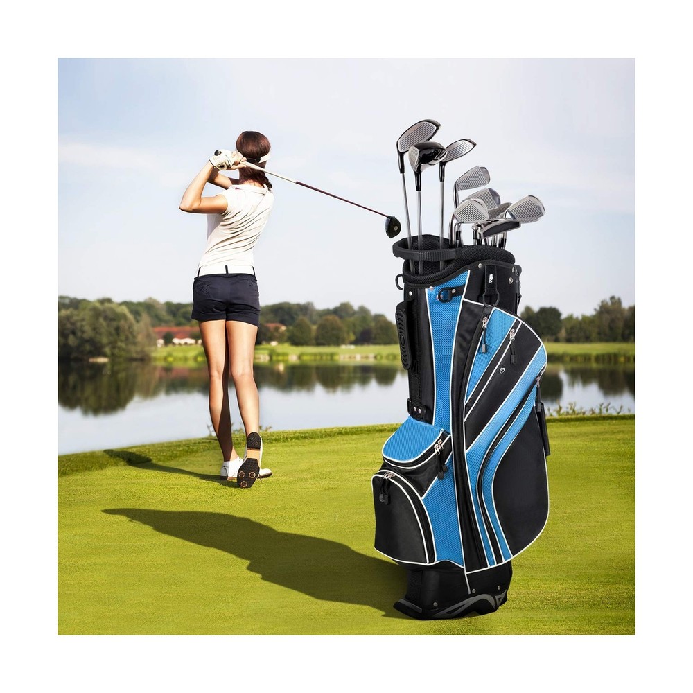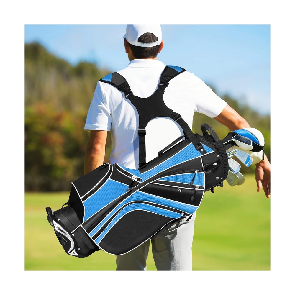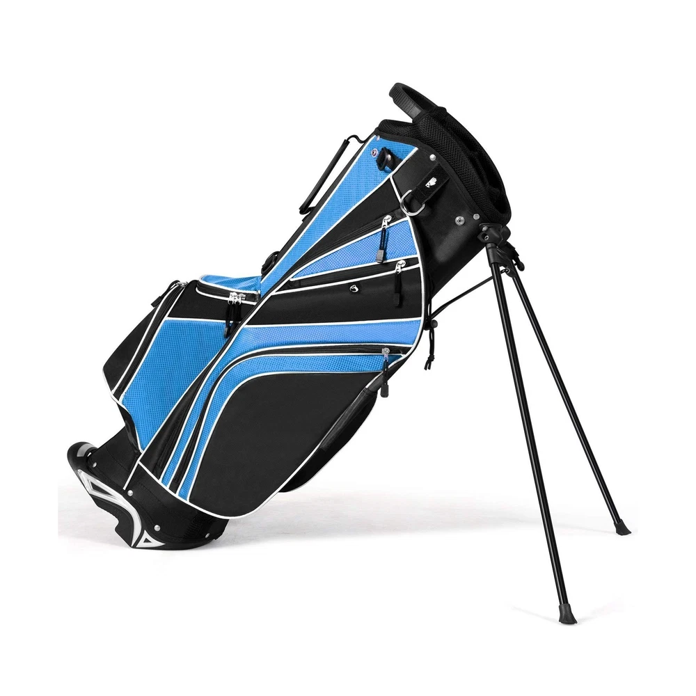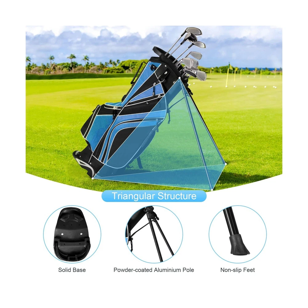 Tangkula Golf Stand Bag with 6 Way Top Dividers, Lightweight Golf Bag with Adjustable Dual Strap & 8 Pockets, Waterproof Rain Hood, Portable for Men Women Description Features: Water Resistance: Made of sturdy material, our golf bag is water resistance to avoid any liquid to permeate. And its sturdiness can well up to the additional wear and tear while using it. It surely guarantees you a durable lifetime for its sturdy construction. Reasonable Capacity: Featuring light weight of only 6 lbs and portability, golf bags 6 way dividers surprisingly offers you enough space to accommodate your golf clubs. There are 8 pockets on this bag to bring you additional storage space, which you can put various accessories in. Considerate Added Values: Backpack-style shoulder strap for extra comfort provides you a convenient handle on the side to quickly carry and go. And the special zipper design adds both practicability and aesthetics to this product. Specially designed umbrella holder offers you a good assistance. Premium Travel Helper: golf travel bag is quite great for traveling for it takes up very little space in a trailer, camper, or car trunk due to its compact body. You can just take it to your desired place effortlessly. And the bag can be stored neatly when you do not use it. Foot Support: With a mixed color and durable automatic stand with anti-slip foot, it can stand steadily and balanced as you want to release your hands. And it can also stand straight with a plastic chassis. A rubber foot pipe bracket can well prevent the scratch. Product Details: Brand: Tangkula Color: Blue Material: Polyester Strap Type: Adjustable Product Dimensions: 11"L x 8"W x 32.5"H Number of Dividers: 6 Item Weight: 6 Pounds Number Of Pockets: 8 Manufacturer: Tangkula Golf Club Bag Type: Stand Golf Bag Brand: Tangkula Color: Blue Material: Polyester Strap Type: Adjustable Product Dimensions: 11"L x 8"W x 32.5"H Number of Dividers: 6 Item Weight: 6 Pounds Number Of Pockets: 8 Manufacturer: Tangkula Golf Club Bag Type: Stand Golf Bag Item Package Dimensions L x W x H: 35.25 x 13.25 x 10 inches Package Weight: 3.38 Kilograms Item Dimensions LxWxH: 11 x 8 x 32.5 inches Brand Name: Tangkula Warranty Description: / Model Name: AM0047SP Suggested Users: unisex-adult Part Number: AM0047SP Included Components: 1 x Golf Stand Ba,g 1 x Rain Hood Date First Available: October 14, 2016 Delivery We Do Not Ship Outside of the Continental US. Return Policy All items qualify for returns within 30 days of receipt. Buyer is responsible for return shipping on any item that is not damaged. Feedback We take our reputation seriously, we buy and sell online, so we understand the value of trust. If you are unsatisfied with your order, please contact us and we will work with you to resolve it to your satisfaction.