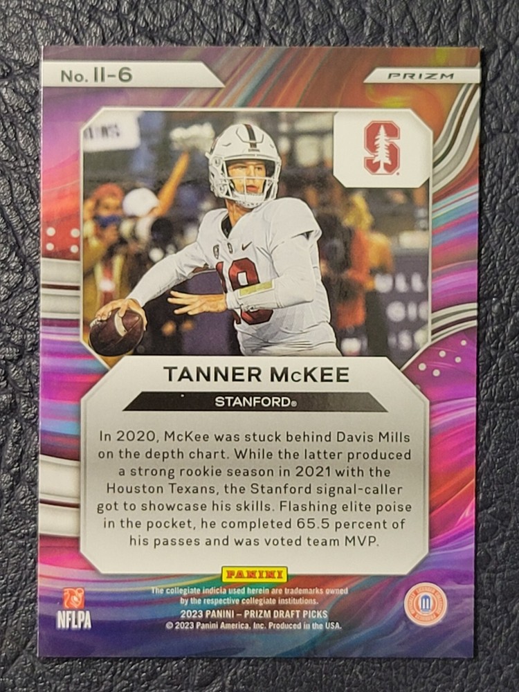This is a rare and highly sought-after Tanner McKee 2023 Prizm Draft Picks Instant Impact Green & Chronicles Clearly card pair (2). It features a parallel and insert design, with a rookie status, and is made of high-quality card stock material. The cards are from the 2023 Panini Chronicles Clearly Donruss Draft Picks and 2023 Panini Prizm Draft Picks sets, making it a must-have for any serious collector. This card duo has a Standard size and is in English language. It showcases Tanner McKee, a player from the Stanford Cardinal and Philadelphia Eagles teams, who participated in the Super Bowl event/tournament. The card is manufactured by Panini in the United States and is a great addition to any sports trading card collection.