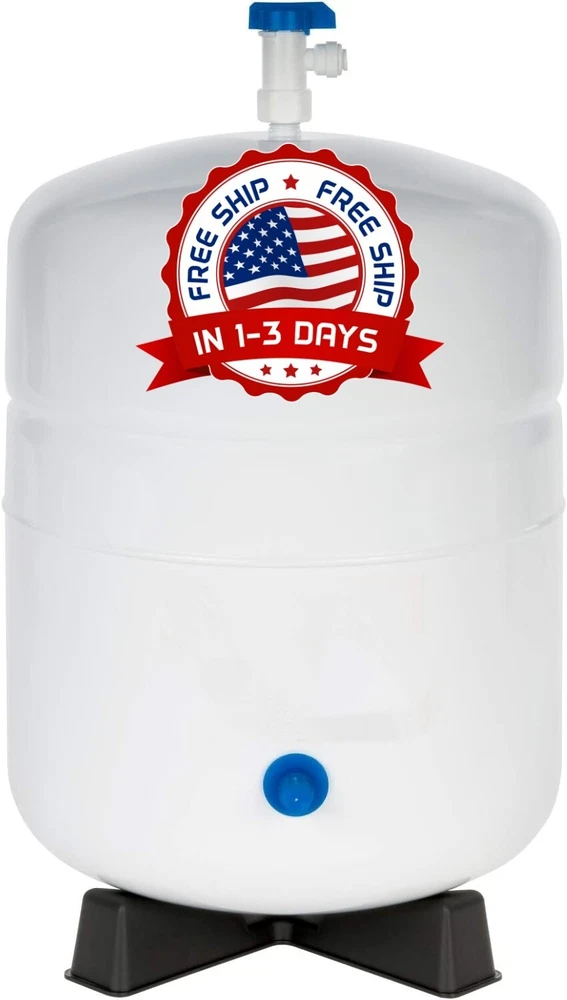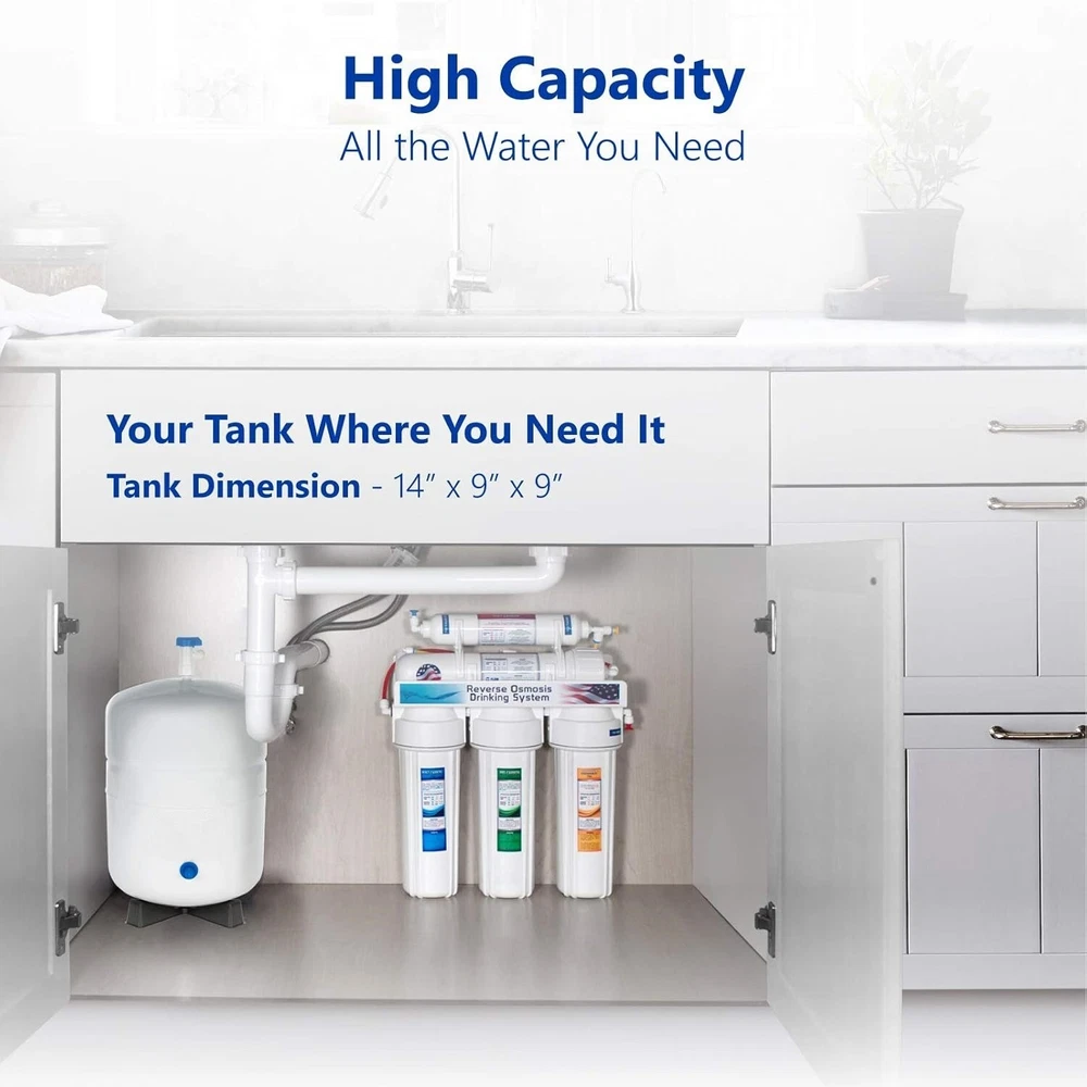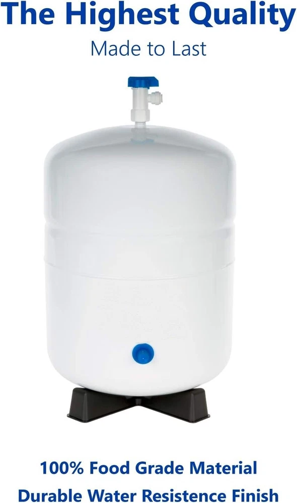 Tanque de expansión del sistema de filtración de agua: tanque de 3 galones NUEVO Tanque de ósmosis inversa: fabricado con materiales 100 % aptos para uso alimentario, el tanque de agua almacena y mantiene el agua libre de impurezas y productos químicos agresivos. El complemento perfecto para cualquier sistema de agua de ósmosis inversa. Tanque de agua fácil de instalar: los reemplazos del tanque incluyen una válvula de bola de tanque gratuita para una fácil instalación y reemplazo con un diseño de conexión rápida de 1⁄4”. Tanque de agua de alta calidad: este tanque de almacenamiento de agua está fabricado con domos de acero embutido duraderos con soldadura de precisión para garantizar un valor duradero. Dimensiones del tanque de agua: este tanque de agua compacto está diseñado (14 x 9 x 9) para caber debajo de la mayoría de los fregaderos de cocina. Almacena hasta 2,2 galones de agua para agua potable filtrada a pedido.