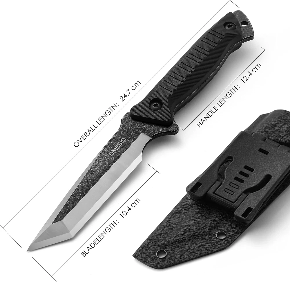 TANTO BLADE DESIGN: Our fixed blade knife with sheath features a distinct and efficient tanto blade design, known for its exceptional piercing ability and durability. HIGH-QUALITY BLADE: Fixed blade knife full tang from dependable 420HC stonewashed steel, the blade offers razor-sharp cutting performance, effortlessly tackling various materials, making every task a breeze. NON-SLIP G10 HANDLE: Black G10 handle with finger guard groove, featuring a textured pattern for a secure grip, non-slip — ergonomic design for exceptional hand control, flexibility, and comfort. MULTI-ANGLE WEARING: Use the horizontal carry knife more safty & portable. Lanyard hole and the high-strength lightweight Kydex sheath with a universal clip can be adjusted horizontally and vertically. The end of handle can be multi-purpose such as glass breaker. MULTI-PURPOSE OUTDOOR KNIFE: This tactical hunting knives excels beyond limits, serving as an indispensable tool for a wide range of outdoor activities, from camping and hiking to survival situations. Product Description Omesio Outdoor Knife - If you're looking for a slightly larger and heavier pointed knife, this is not a problem. - High quality - Crafted with a full tang blade - Sturdy and durable POLYHEDRAL TANTO BLADE Featuring a polyhedral Tanto blade design, our fixed blade tactical knife excels in cutting and piercing tasks, offering versatility for various challenges. ERGONOMIC G10 HANDLE Designed with ergonomics in mind, the G10 handle ensures a comfortable grip and excellent control, enhancing your handling experience. STURDY FULL TANG Built with a sturdy full tang construction, this horizontal carry fixed blade knife provides stability and durability, making it a reliable companion for demanding tasks. SELECTED GIFTS Perfect for both outdoor enthusiasts and knife collectors, it's a carefully selected gift choice that will be truly appreciated. MULTI-PURPOSE OUTDOOR KNIFE Suitable for various outdoor activities, including camping, hiking, and emergency situations. The end of handle can be multi-purpose such as glass breaker. EXCEPTIONAL VERSATILE KYDEX SHEATH The high-strength lightweight KYDEX sheath comes with lanyard holes and a universal clip for both horizontal and vertical adjustments. The detachable and adjustable spacers on the clip are suitable for almost any belt size, ensuring convenient carry.