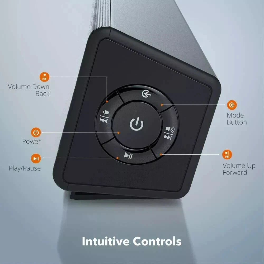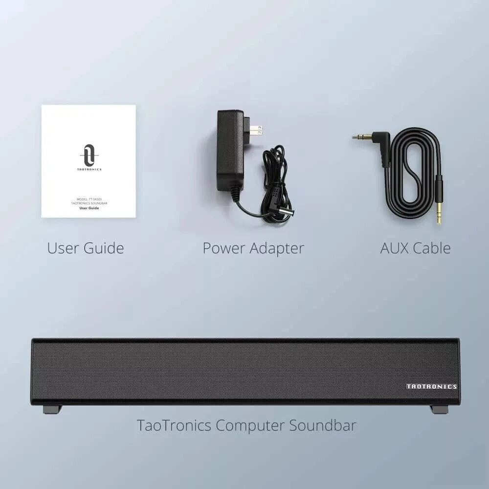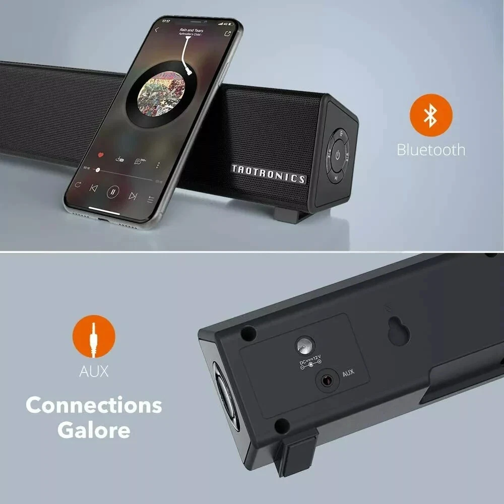 TaoTronics Bluetooth 5.0 Computer Speaker Wired/Wireless Mini Sound Bar SK025 Stream wirelessly: connect via Bluetooth 5.0 or plug in physical AUX and RCA cable connections, choose your most convenient Immersive sound experience: housing Two 5W full range speakers, The sound bar delivers a crisp, mesmerizing sound Easy set up in minutes: The package contains all equipment needed - Unpack, plug in, and enjoy Widely compatible: The computer sound bar also connects with your phone, tablet, MP3 player, or any other device with Bluetooth, RCA, or audio connectivity Fits your desk perfectly: The ultra-slim sound bar is tailored to save precious space and avoid cluttering -----