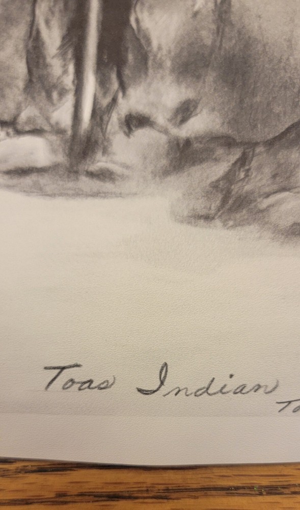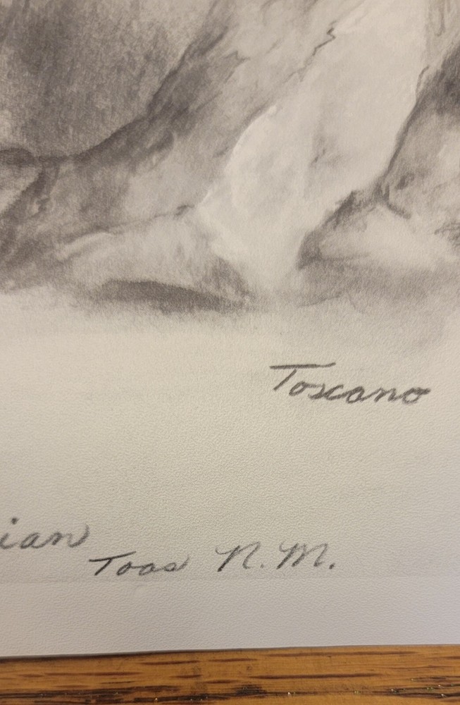 This beautiful print by Dee Toscano depicts a Taos Indian Native American deep in thought. Created in 1973, this charcoal sketch on paper measures 12 inches in height and 18 inches in length. The print is unframed and is a reprint of the original. The piece showcases traditional Taos culture and the beauty of the American Indian. It is a great addition to any art collection and is perfect for those who appreciate contemporary art produced in the 1970s. This print is a medium-sized piece. It is printed on high-quality paper and is a great representation of the Taos people. See pictures for details