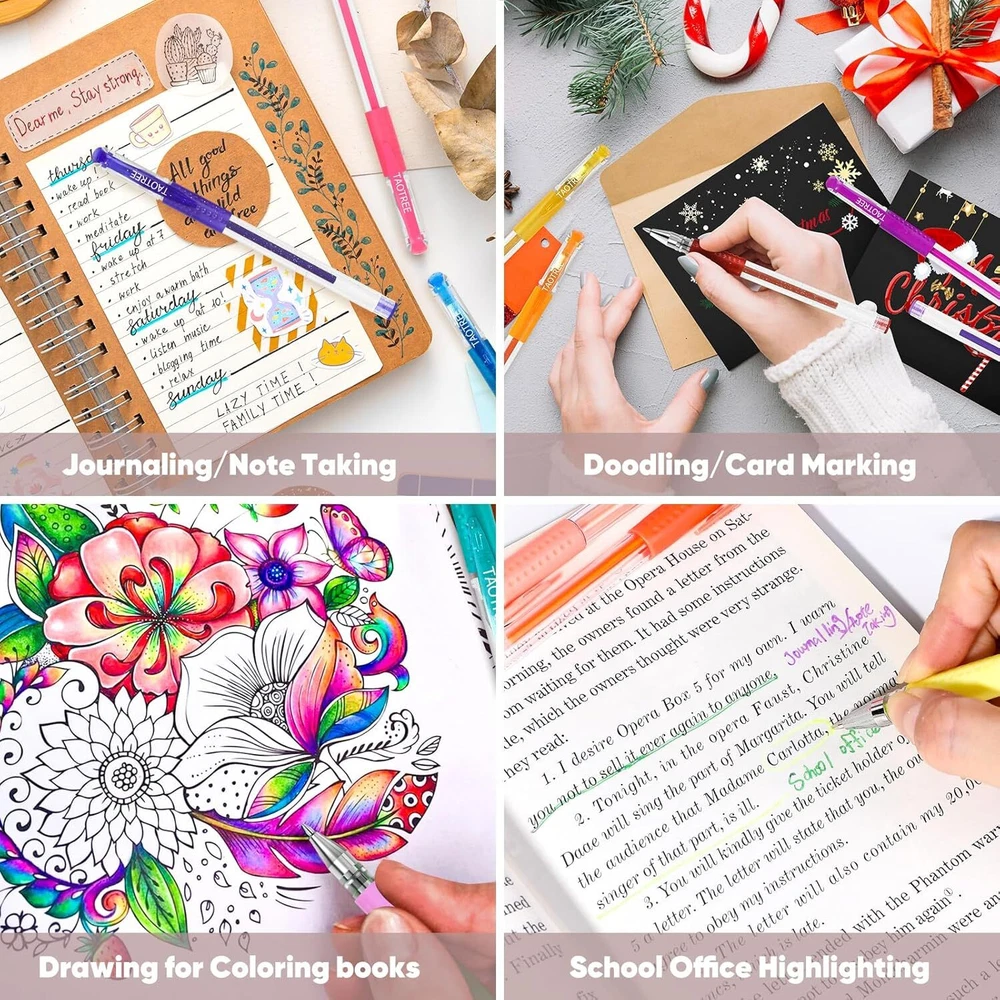 Taotree Glitter Gel Pens, 32 Color Neon 1 Count (Pack of 32), 32 Multicolor Product Details Manufacturer: Taotree Brand: Taotree Item Weight: 10.2 ounces Product Dimensions: 14 x 6 x 0.5 inches Item model number: 662964 Is Discontinued By Manufacturer: No Color: 32 Multicolor Closure: snap Grip Type: comfort grip Material Type: Plastic Number of Items: 32 Size: 1 Count (Pack of 32) Point Type: Fine Line Size: 0.8 Millimeters Ink Color: Multicolor Manufacturer Part Number: 662964 Brand: Taotree Writing Instrument Form: Marker Pen Color: 32 Multicolor Ink Color: Multicolor Age Range (Description): Teen Girls Boys Kids Adult Artists 32 INDIVIDULE vivid colors glitter gel pens, included Colored Pens, Glitter and Neon-Glitter. 40% more ink for Long Lasting, glitter gel pens for Coloring Books, kids and Girls Coloring Books. crafts art supplies for adults. Gel Pens, Smooth glitter colored pens with fine point tip 0.7mm - 1.0mm. Taotree gel markers will produce smooth fine lines and make your artwork pop right off the page. Sparkly gel pens for adult coloring books and journaling. Each Gel Pen is fitted with Comfort Grip, easy to hold and comfortable for writing, drawing, scrapbooking, sketching, Crafting, doodling, art designs and journaling. coloring pens for adults. Acid-free and non-toxic ink doesn’t smear, fade, or skip. Premium Gel Pens set for Kids Coloring Books, School Art Projects, Party Invites, Greeting Cards, DIY Decoration, Letters to Friends. The Glitter Gel Pens come in a nice plastic storage case with fold over snap closure which can be easily placed in backpacks. For using in school, travel or used in the home and office to coloring. Great Back to School Stationary, planner or journaling supplies for Christmas, Birthday, Mother's Day, Valentine's Day, Thanksgiving Day, Party