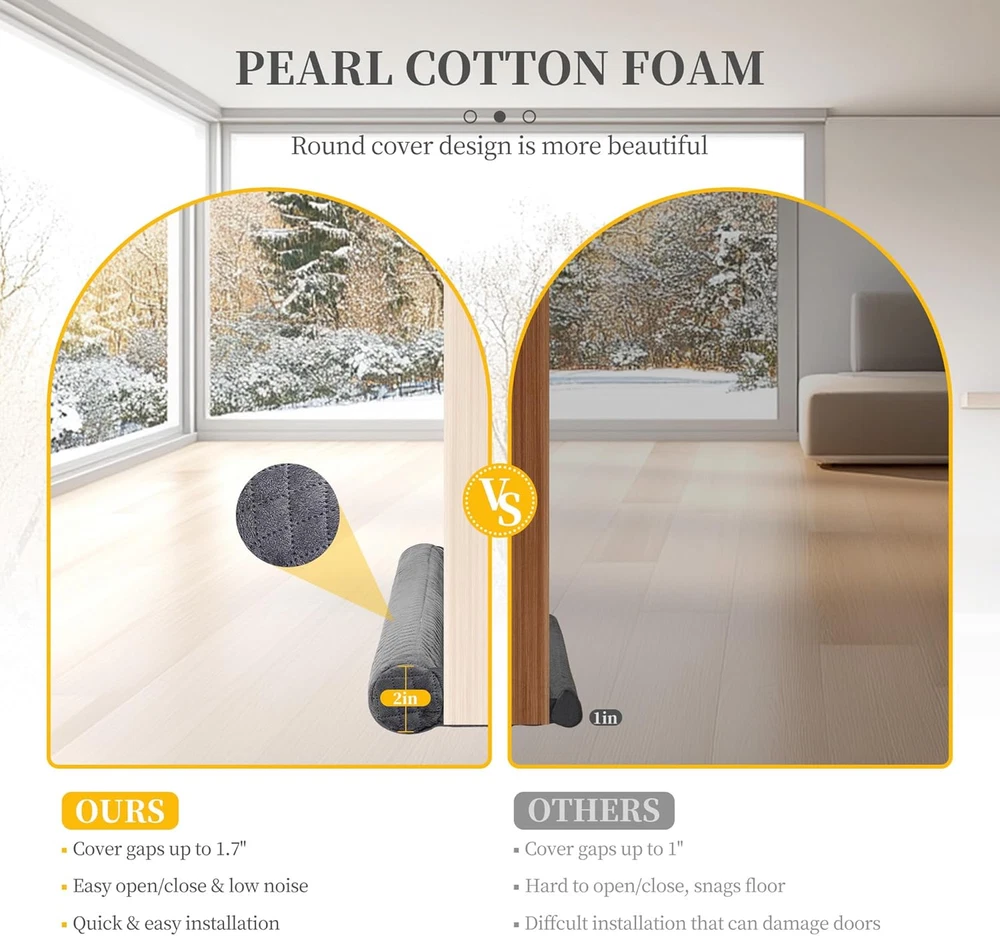 Store New Arrivals Add to Favorite View Feedback Contact Premium Velvet Door Draft Stopper, 30'' to 36'' Adjustable Gap Filler, Double-Sided Windproof Seal, Easy Install to Block Noise, Cold Air, Light, Dust, and Drafts Description Item model number MD Color Gray Material Velvet, Cotton, Polyester Country of Origin China Item Weight 13.4 ounces Number of Pieces 1 Package Dimensions 13.03 x 11.93 x 2.91 inches Size 30'' to 36'' 1. High-Quality Materials and Versatile Design: The Cieeyuo door draft stopper is made from three layers of fabric—velvet, cotton, and polyester. This thick fabric is designed to improve sound insulation effectively. You'll also notice that this durable bottom seal is smooth, reducing noise from friction, and it slides easily across any type of floor. It's ideal for bedroom, indoor, garage, and basement doors but isn't recommended for exterior doors with thresholds. 2. Adjustable Fit and Complete Coverage: This door stopper is designed to fit doors between 30 and 36 inches wide. The Door Draft Stopper is best suited for gaps between 0.5" and 1.7". 3. Comprehensive Protection: This under-door draft stopper mainly blocks cold or warm air, helping to maintain energy efficiency. While it also offers some soundproofing, it's not 100% effective, so consider the overall soundproofing of your door and walls. Additionally, it blocks dust, insects, smoke, and odors. The dark gray color enhances its light-blocking ability. 4. Easy to Install and Clean: Installation is straightforward—just measure and cut the foam tube to fit your door's width, then slide the stopper under the door. It moves easily with the door and can be removed and washed to keep it clean, making maintenance convenient. 5. Reliable Customer Support and Satisfaction Guarantee: At Cieeyuo, your satisfaction is our top priority. If you're not completely happy with your purchase, our customer service team is ready to assist. We guarantee a response within 24 hours to address any concerns, ensuring your home stays comfortable and draft-free with our door accessories. Product Description It can quieten your children's room and let your baby sleep well. If there is often noise in the corridor of your home, it can also effectively prevent it. If your pet usually makes noises at night, then it can solve these troubles for you. Ciieyuo Door Draft stopper selects inch foam cotton, which is upgraded on the basis of 1 inch and 1.5 inches, so that it can better fit the door. Can this bottom door cover gap effectively reduce noise? This product cannot achieve 100% noise reduction,because the noise is directly related to our doors and walls. Our product uses three layers of thick fabric to better improve the sound insulation effect,which can withstand your horizontal comparison. What door gap size is the Door Draft Stopper best suited for? The Door Draft Stopper is best suited for gaps between 0.5" and 1.7". Gaps smaller than 0.5" may result in a tighter fit, making it harder to slide, while gaps larger than 1.7" could reduce the sealing effectiveness Can this door draft blocker be applied to external doors? If you use the product on an external door, be sure to pay attention tha and it cannot be used if there is a high threshold on the outside of the door. Is it possible that this door draft stopper is not the right size? Be sure to check the size before purchasing to avoid it not being suitable for your door.Because it is very thick, it is not suitable if the door gap is too small. Can this under door draft stopper slide on carpet? This product is made of smooth velvet material and can slide easily on carpets. However, if the carpet is very thick and the gap between the door is too small, using this product will affect the opening and closing of the door. ABOUT US We offer the best prices around on high quality products. Our E-store includes media such as books, movies, music and games while offering electronics, toys, sporting apparel, clothing, tools, general home, garden items and more. SHIPPING We are always working hard to ensure your package arrives as soon as possible. Please understand that some factors like weather, high postal traffic, and the performance of shipping companies are outside of our control. We offer free shipping to the lower 48 states and ship within 2 business days of payment, usually sooner. We do not accept P.O. Boxes. Please provide a physical address. RETURNS We offer a 30-Day Return Policy on items which you are not completely satisfied with. You have the option for a full-refund or an exchange of the item. No returns are available on items shipped outside of the USA. PAYMENT We accept PayPal. CONTACT US This page content is yet to come Please ad us to your favorite seller and visit again later Thank You CUSTOMER SATISFACTION We try our very best to make sure every customer is completely satisfied. If there's a problem, message us! We're happy to help.