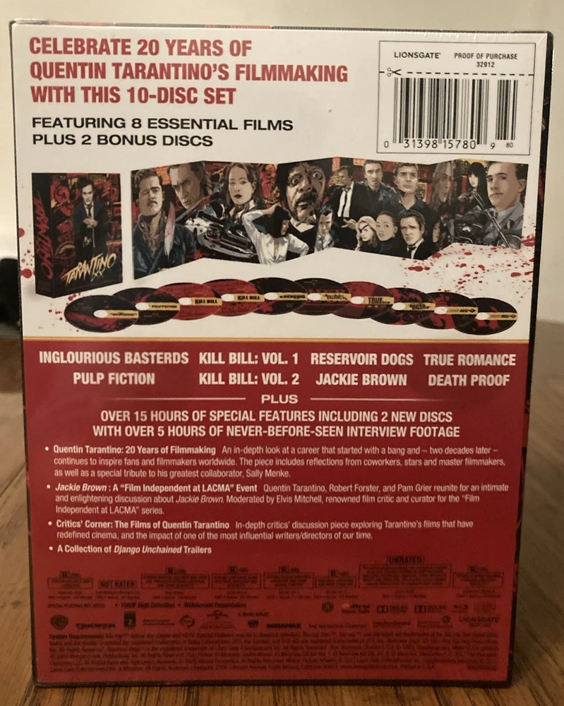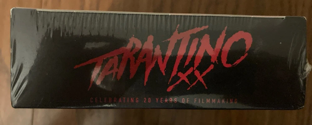 Tarantino XX: 20th Anniversary Collection (Blu-Ray), 10-Disc Box Set. Includes inglorious Bastards, Pulp Fiction, Kill Bill: Vol 1, Kill Bill: Vol 2, Reservoir Dogs, Jackie Brown, True Romance and Death Proof on blu-ray. Also contains 2 bonus discs with over five hours of special features. Small tear on plastic wrap (as pictured).