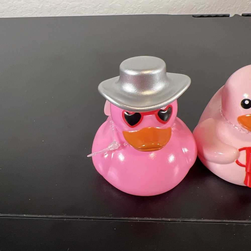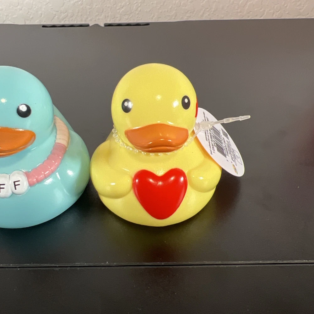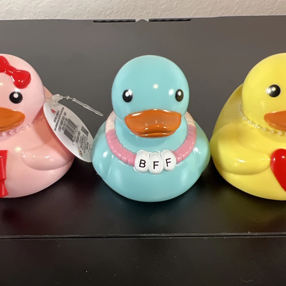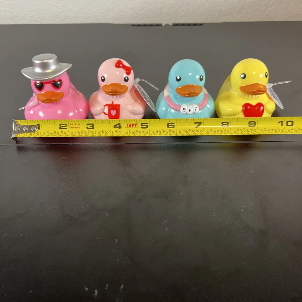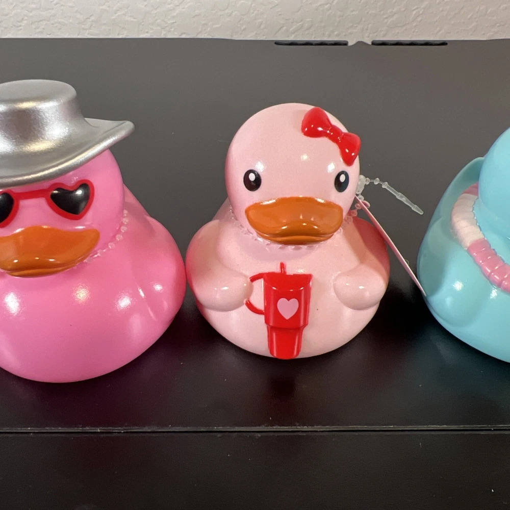 This product is a set of 4 small multicolor rubber duck figurines featuring various designs related to Valentine's Day and the Target Bullseye Playground theme. The duckies include features like a BFF, cowboy hat, and Stanley Cup designs, all in a Valentine's Day theme. These figurines do not require any additional parts and are easy to care for. They are suitable for display in any room, including the bathroom, and are a fun addition to holiday and seasonal décor.