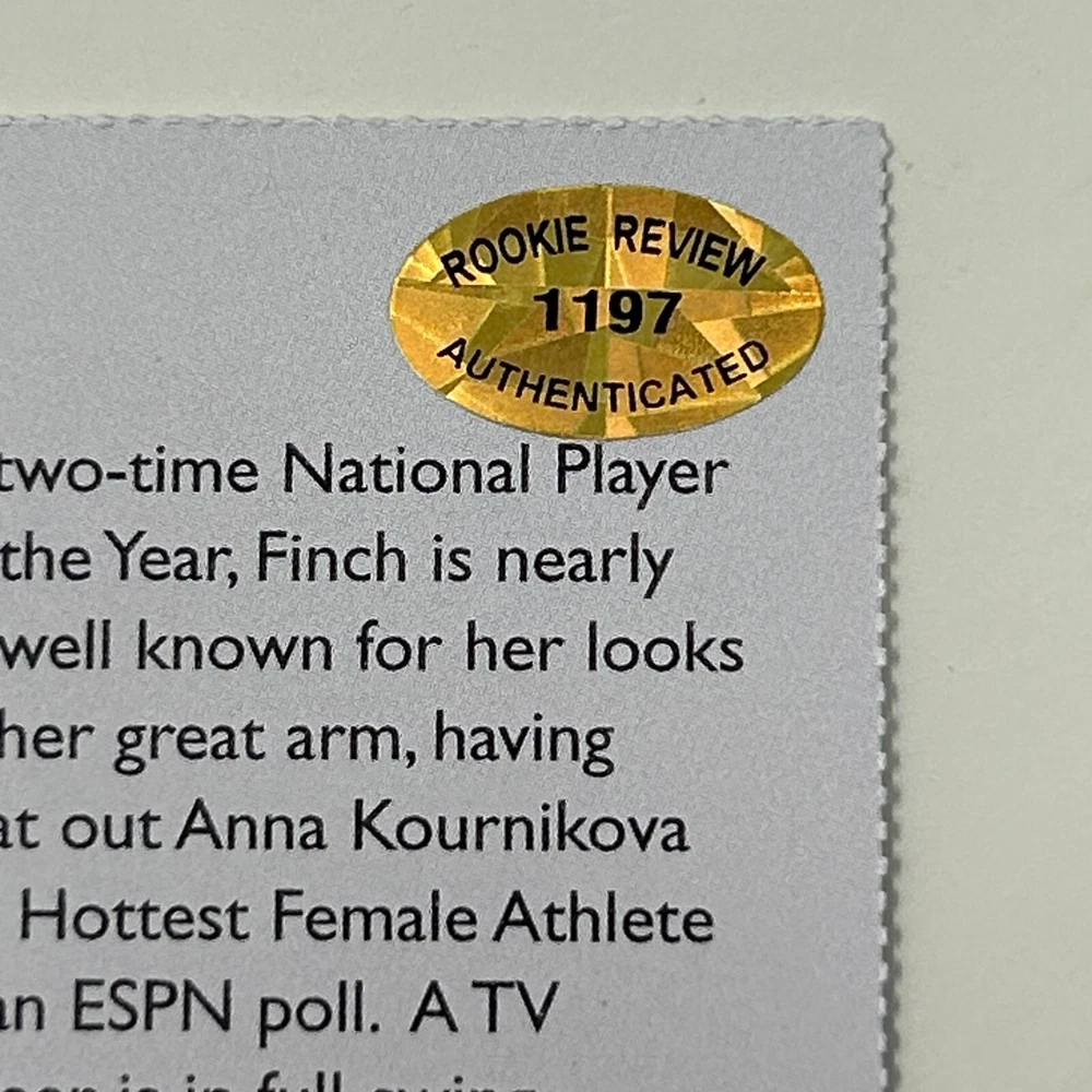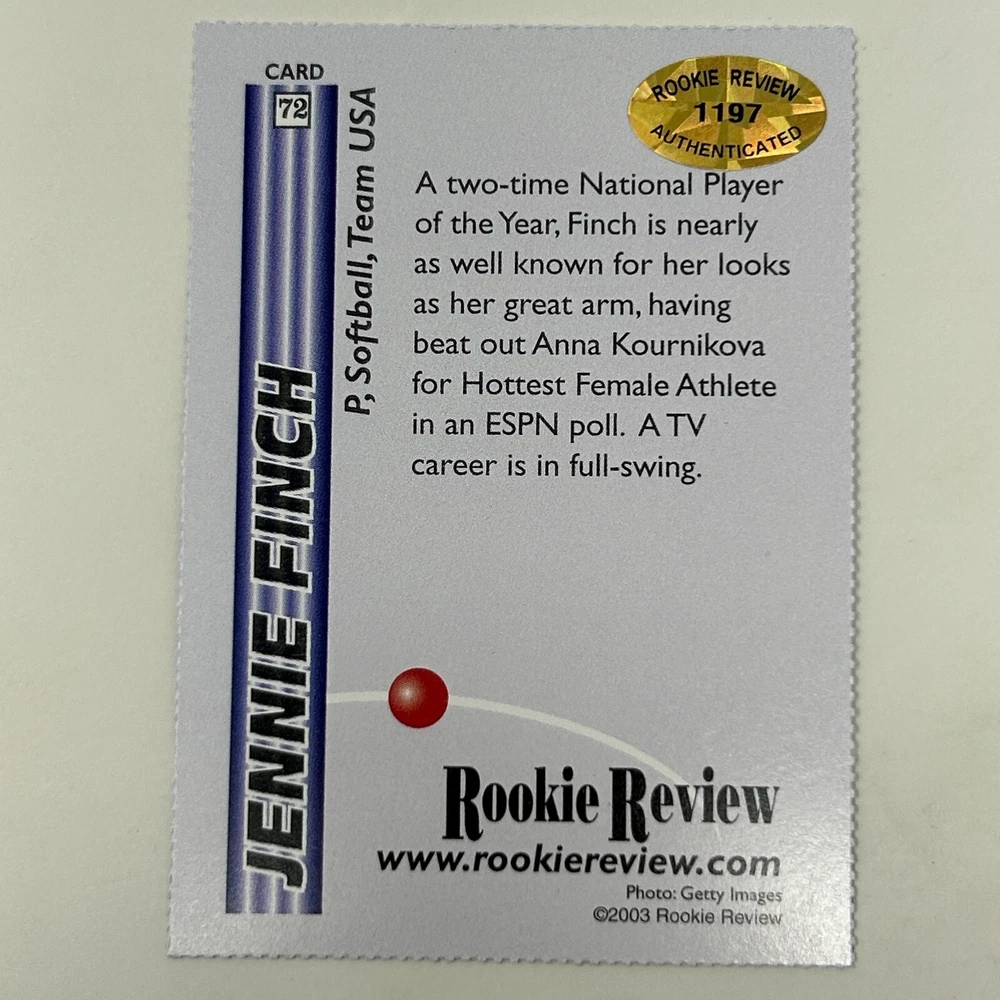 Vintage Y2Ks 2003 Jennie Finch 72 Autographed Signature Trading Sports Card Rookie Review Signed Authenticated USA Fastpitch Softball Summer Olympic Games Olympics Arizona Wildcats Pitcher Condition: You get the one shown in the photos. Corners and edges all look good for being punched out from a magazine's card sheet and handled by Ms. Finch while she signed it. Has a Rookie Review Authenticated sticker on it. This sticker is not on the same cards that are not signed.