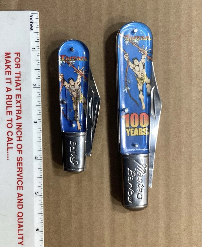 You are purchasing a vintage pair of Tarzan Pocketknives celebrating Tarzan’s 100 th Anniversary, 1912-2012 in the original box produced by Barlow & Master Barlow. The Tarzan set includes two pocket knives, one is a Master Barlow with a single blade, the smaller knife is Barlow with two blades and has a little ball type game in the handle. The Tarzan knife set is in unused mint condition in the original box. The Tarzan knife set has been displayed in a Tarzan collection since it was purchased new. Please refer to photos as they are an important part of the description and ask any questions before purchasing. Please check my other items offered on e-Bay. Yes, I do combine shipping! Payment would be appreciated within 4 days. I will gladly combine items to save on shipping. International bidders please check shipping costs before bidding. Items will be shipped using eBay's Global Shipping Service.