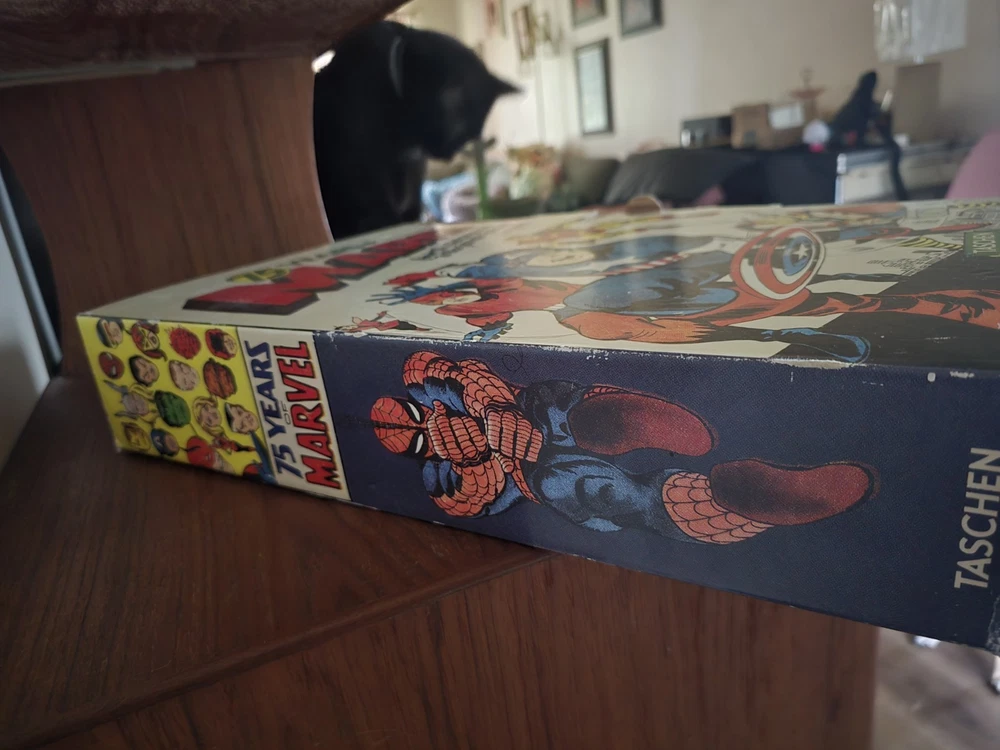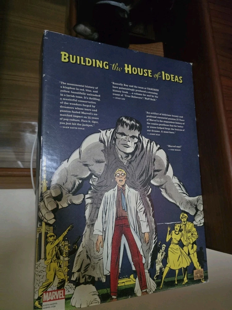 The product is a hardcover book titled "75 Years of Marvel" by Roy Thomas. Published by Taschen in 2014, the book celebrates the history of Marvel Comics from its golden age to the Silver Screen. The box containing the book may have some damage, but the book itself has never been opened. This collectible item is a must-have for fans of US Comics, specifically the Marvel Universe, and showcases the colorful world of superheroes in the Modern Age.