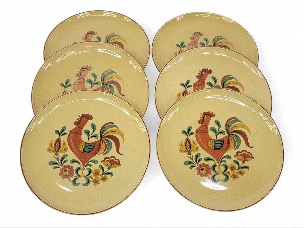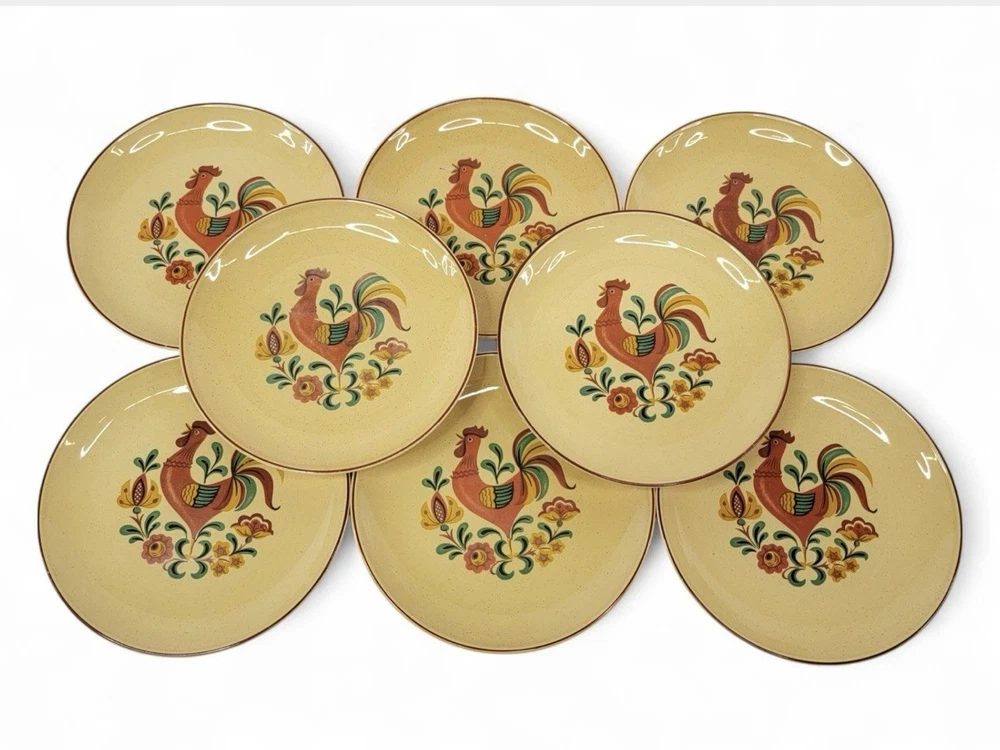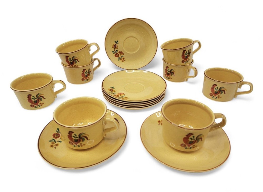 The Taylor Smith Taylor Vintage Ironstone Cannes Atomic Onion Dinner Coffee Set is a charming and unique dining set featuring a rooster pattern in a vibrant yellow color. This round-shaped set includes 8 place settings, with a variety of pieces such as bowl sets, dessert plates, salad plates, bowls, dinner plates, and mugs. Made from ceramic with a smooth finish, this set exudes a retro charm that is perfect for adding a touch of vintage flair to your dining experience.