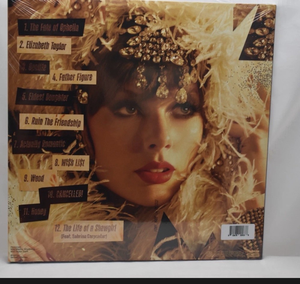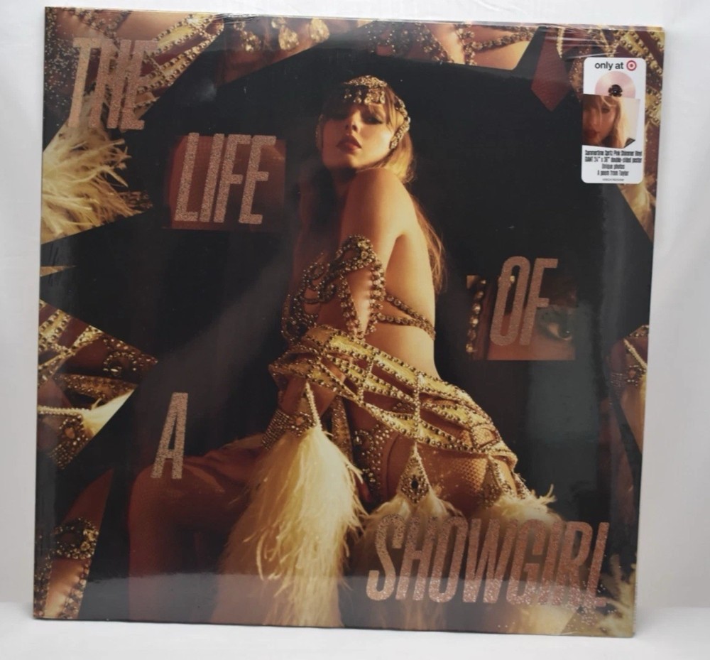 VINYL (NEW & SEALED) COVER (NM) may have minor corner bumps/edge creases Please view all pictures and if more are needed, just let me know! Taylor Swift - The Life Of A Showgirl (LP) The Crowd Is Your King Edition Limited Edition Summertime Spritz Pink Shimmer Vinyl (Opaque Pink And Pale Yellow Pearlescent With Gold Shimmer) Promoted as 'limited run' and 'first and only pressing'. Issued in a glossy gatefold jacket with fold out panels with left and right spines, and a top-opening center die-cut pocket to reveal the vinyl disc. The pocket includes an exclusive 24”x36” double-sided poster and a slide-out, gatefold lyric booklet that has a pocket to hold the record, which is in a clear plastic sleeve. Tracklist A1 The Fate Of Ophelia 3:46 A2 Elizabeth Taylor 3:28 A3 Opalite 3:55 A4 Father Figure 3:32 A5 Eldest Daughter 4:06 A6 Ruin The Friendship 3:40 B7 Actually Romantic 2:43 B8 Wi$h Li$t 3:27 B9 Wood 2:30 B10 Cancelled! 3:31 B11 Honey 3:01 B12 The Life Of A Showgirl