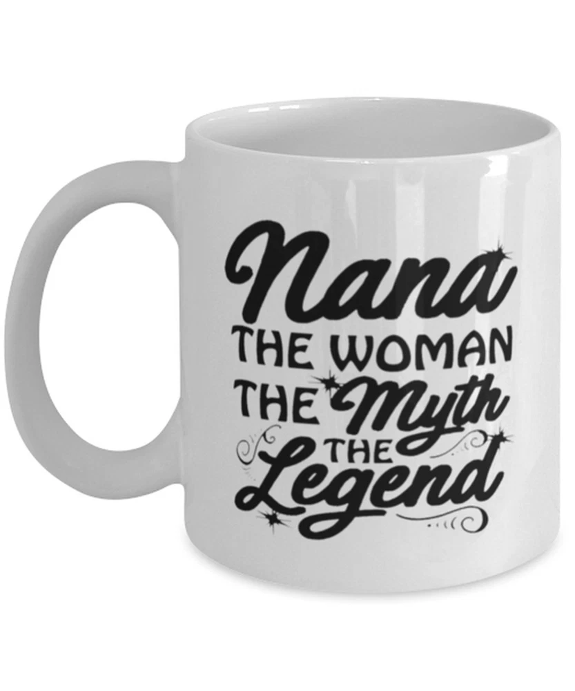 Grandmother Funny Coffee Mug Nana The Woman The Myth The Legend Grandma Mug Product Details.. This high quality 11oz. ceramic white mug has a premium hard coat that provides crisp and vibrant color reproduction sure to last for years. Perfect for all hot & cold beverages. The highest quality printing possible is used. It will never fade no matter how many times you wash it. Material: 100% Ceramic. Print both sides. Dishwasher and Microwave Safe. High Gloss + Premium White Finish. Printed in the U.S.A. Personalized & Custom. We support personalized and custom mug to add custom, when placing an order, you can add notes to the "order note" in shipping address section. Also you can contact us directly via message. Shipping Info. Ready to ship in 1 to 2 business days, All products are made-to-order and proudly printed in the United States. Shipped by USPS and DHL, You will receive your order in 5-7 days. Replace & Refund. All products are defective during shipping broken, chipped will be replaced free of charge. You are not satisfied with the product, we will refund 100% money to you. If any other issues arise, please do not hesitate to message, we would be more than happy to assist you.