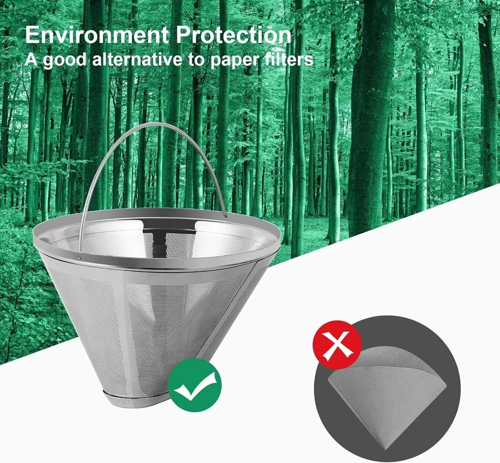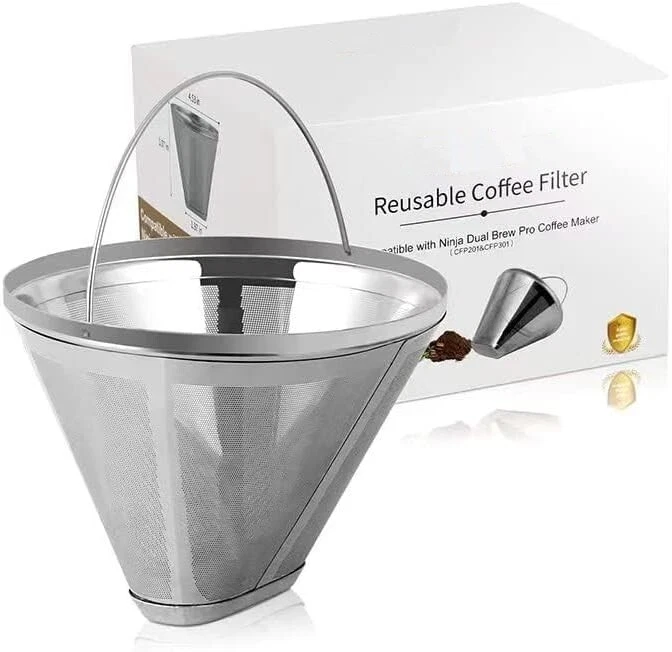 Tazas K Reutilizables Paquete De Filtros Cafe Reutilizables Ajuste Universal NEW El filtro de café de acero inoxidable es totalmente compatible con Ninja dual brew pro, Ninja coffee bar brewer 8-12 cup, también se adapta a Black & Decker, Cuisinart, Hamilton Beach y más cafeteras cónicas #4. Después de disfrutar del café, el filtro de café para la cafetera Ninja dual brew y los posos de café se pueden sacar fácilmente a través del mango adjunto. El trabajo de limpieza se puede completar limpiando ambos lados del filtro. Este filtro de café reutilizable está hecho de acero inoxidable 304 de grado alimenticio de alta calidad. Es seguro, no tóxico y saludable, por lo que puede usarlo de manera segura. El filtro de café con pantalla de filtro fino puede extraer el café de manera más uniforme y extraer aún más el aceite de grano de café para brindarle un café delicioso. Recibirá 1 * filtro de café de acero inoxidable que es perfectamente compatible con la cafetera Ninja Dual Brew Pro