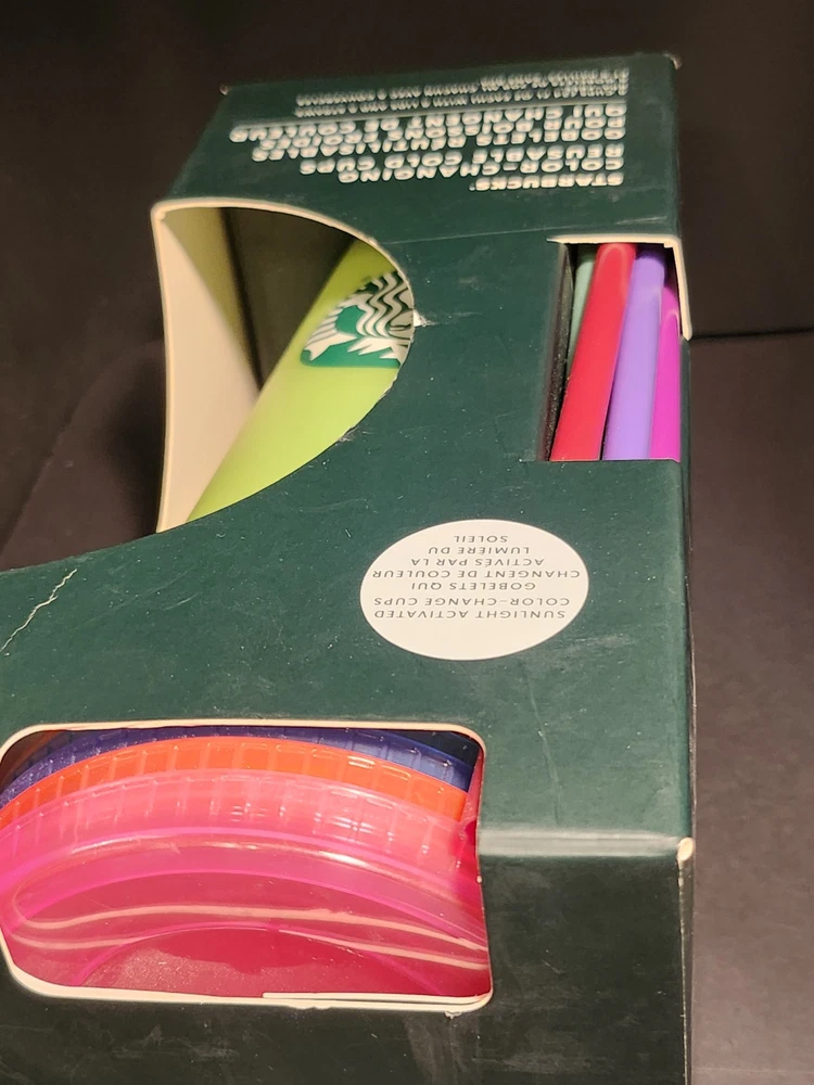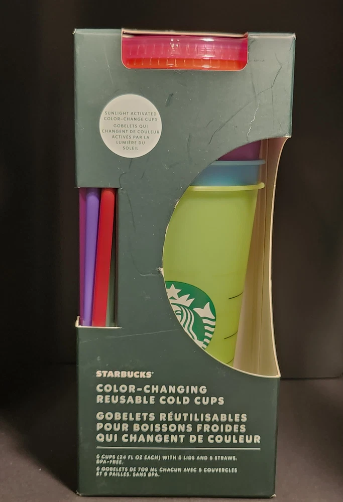 These reusable cold cups are UV activated. Take them outside and the sun will change their color! Take them to your local Starbucks when purchasing your favorite cold drink and help decrease plastic waste. Includes 5-24 ounce cups with matching lids and straws. BPA free. Never used and will come in original packaging.