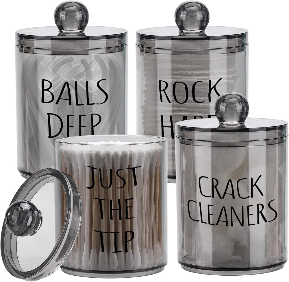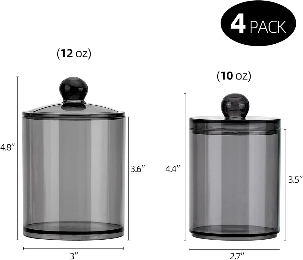 Packing: 2 pcs samll jars into 2pcs large jars, not just 2 jars, please check carefully when you receive the package Size - 10oz: With the lid, height = 4.4 inches, diameter = 2.7 inches Without lid: about 3.5 high, 12oz: With the lid, height = 4.8 inches, diameter = 3 inches Without lid: about 3.6 high Q tip Storage Organizer - Look like glass but are a really sturdy plastic and will not shatter, safe for kids Bathroom Accessories - Each floss pick dispenser has a removable lid and a wide mouth, easy to get them out These canisters are great looking and perfect for the vanity, bathroom and kitchen Product Description 4 Pack Bathroom Accessories Organizer - 12oz & 10oz Qtip Holder Dispenser for Cotton Ball Swab Pad Bathroom Storage Containers 4 individual Jar on the package Little things also allowed. Easy to get your fingers downet your fingers down Hard solid plastic,Looks just like glass - lightweight won't broken and hurt your kids Small size but can hold many things. Doesn't take too much space and it keeps things organized on your vanity 4 lids fit very tightly to keep form dust