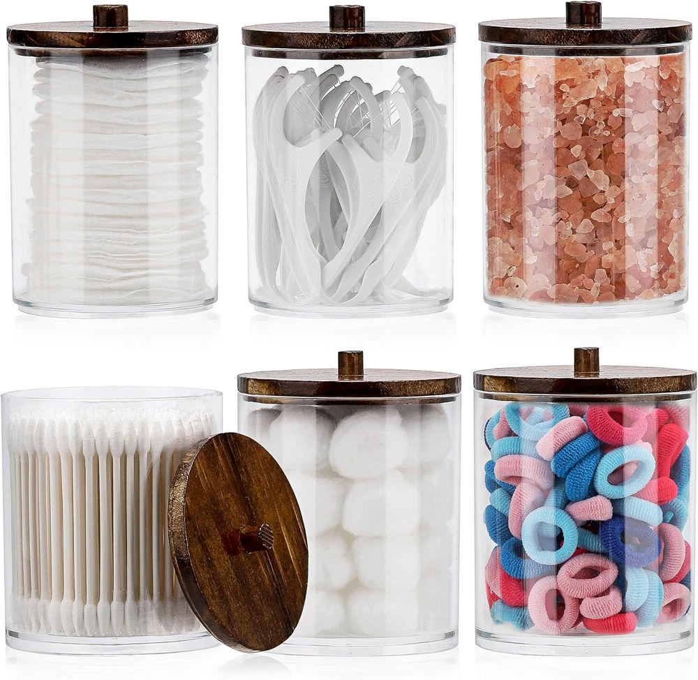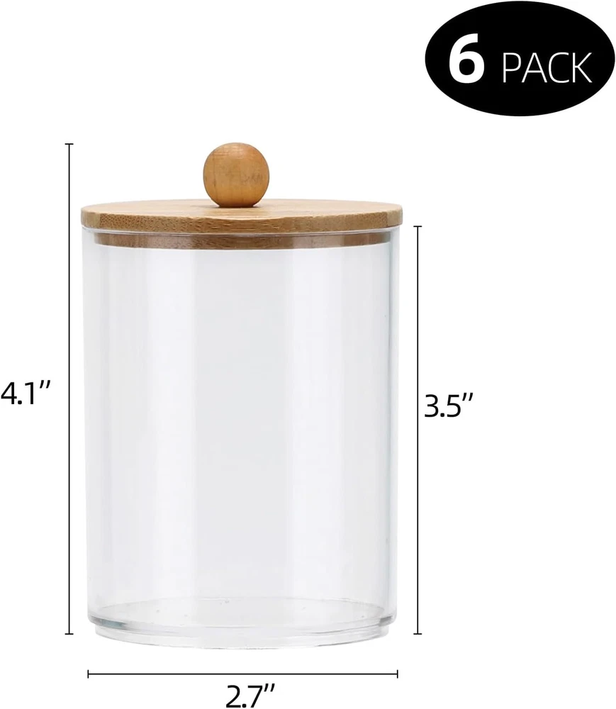 Bathroom Containers - bathroom organizer canisters whit lids are JUST RIGHT for Q-tip, cotton ball, cotton swab, cotton rounds, floss picks, tampon, bath salts, hair tie band, makeup brush, beauty egg, face brush, crayons, candy, pens, clip and more small things Wide Mouth Design - Each qtip holder has a removable lid and a wide mouth, easy to set the Q-Tips perfectly in the dispenser and easy to get them out Waterproof and Moisture-proof - Bathroom jars with lids are sturdy & tight, you keep the apothecary jars in the bathroom and the cotton won't fluff from moisture BETTER DECOR STYLE - Thick clear plastic vanity organizer are good decor elements, modern farmhouse style, very suitable for office and home, restroom, vanity countop, bedroom, kitchen and bathroom decor Bathroom Jars can be used to keep things organized and make it easier to find what you need, 3 pack 10oz, 3 pack 12oz 6 Pack Qtip Holder - 12oz 10oz Plastic Bathroom Containers with Bamboo Lids for Cotton Ball, Cotton Swab, Cotton Round Pads, Floss - Clear Restroom Organizers and Storage Containers (Beige)
