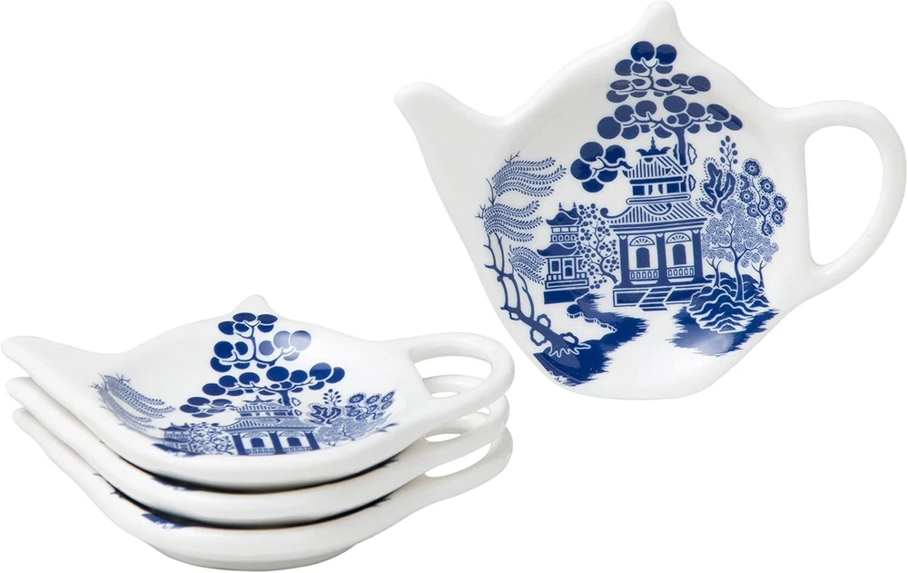 Tea Bag Caddy Holder, Set of 4 (Blue Willow) Blue Product Details Color: Blue Material: Porcelain Brand: Grace Teaware Shape: Leaf Product Care Instructions: Microwave Safe, Dishwasher Safe Is Dishwasher Safe: Yes Product Dimensions: 4.5"L x 4"W Manufacturer: Grace Teaware UPC: 810078462309 Item Weight: 14 ounces Set contains: (4) Teapot Shaped Tea Bag Holders, approx 4-inches wide, Made of Fine Porcelain, Dishwasher Safe. These Tea Bag Holder / Coaster / Caddies are an excellent accessory for all tea lovers. Perfectly sized for holding almost any stir spoon, tea bag, strainer, tea ball or even loose tea. They protect your table top from spills and are ideal for everyday use or any tea party. Makes an ideal hostess gift. Also makes a great kitchen accessory, can be used as; an individual butter dish per person, place card name holder, a small dish for olive pits, dollops of jam, serving sugar lumps, lemon wedges, mint leaves and more. Crafted in China, Designed by Grace Teaware This Tea Bag Holder / Coaster / Caddies are an excellent accessory for all tea lovers. Also makes a great kitchen accessory, can be used as; an individual butter dish per person, place card name holder, a small dish for olive pits, dollops of jam, serving sugar lumps, lemon wedges, mint leaves and more.
