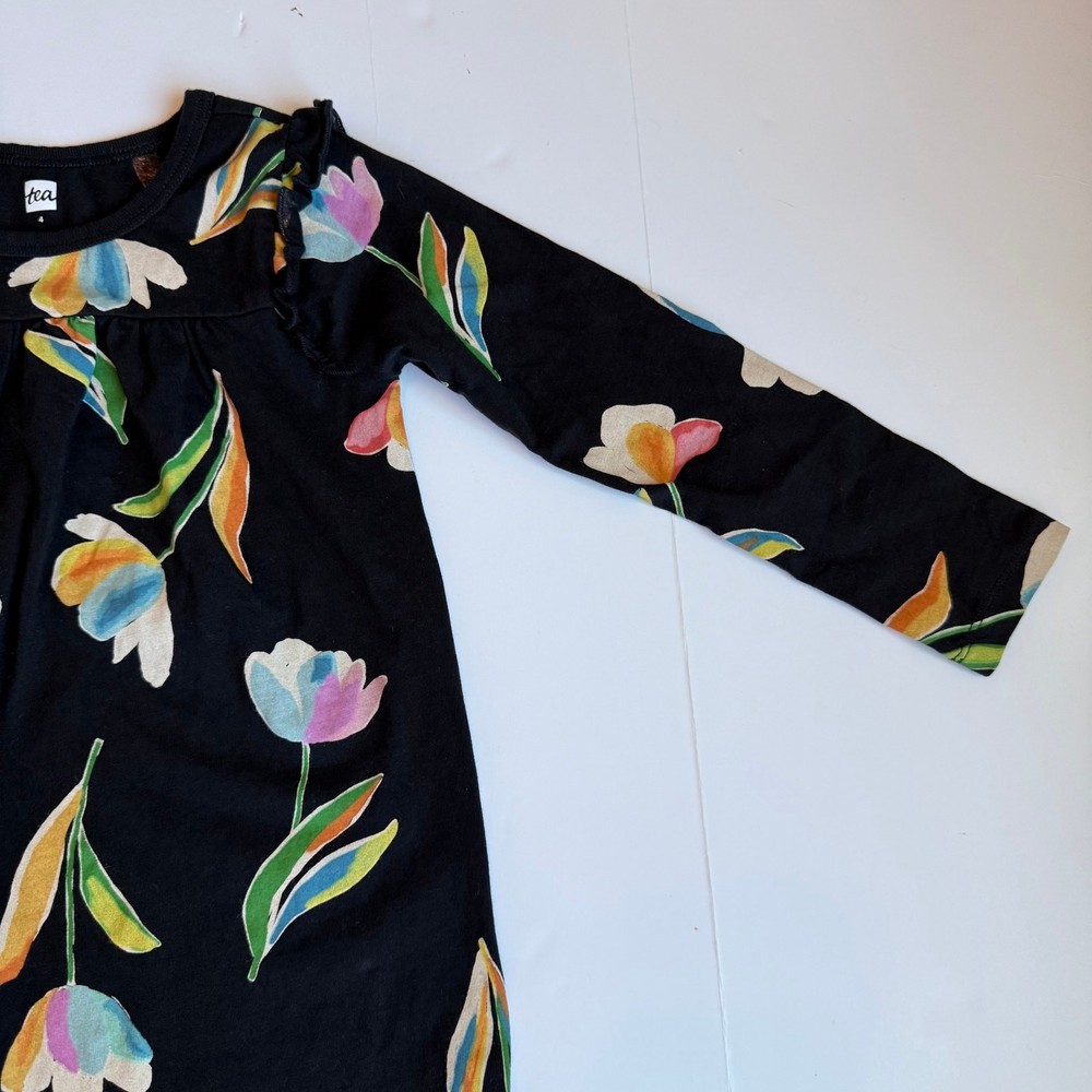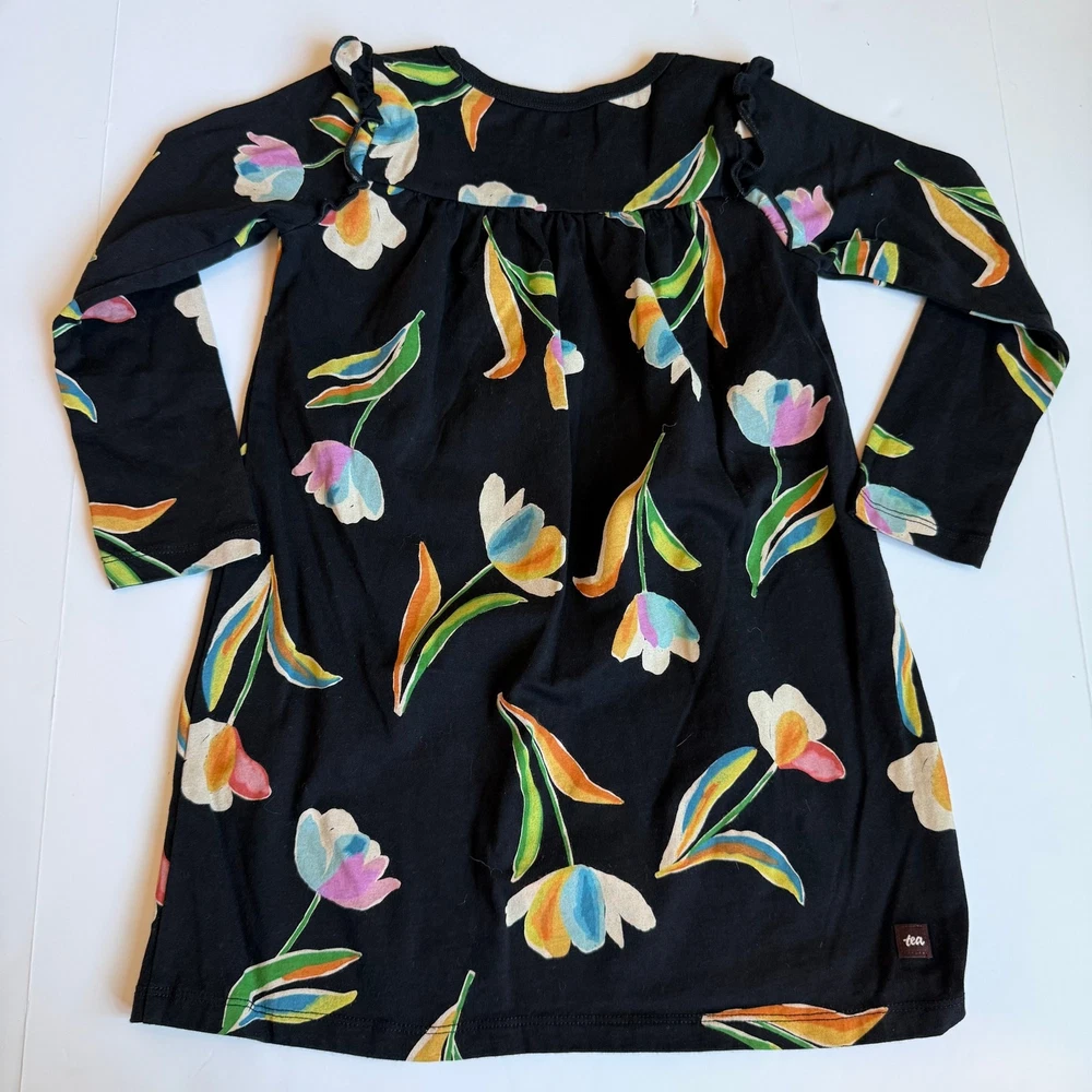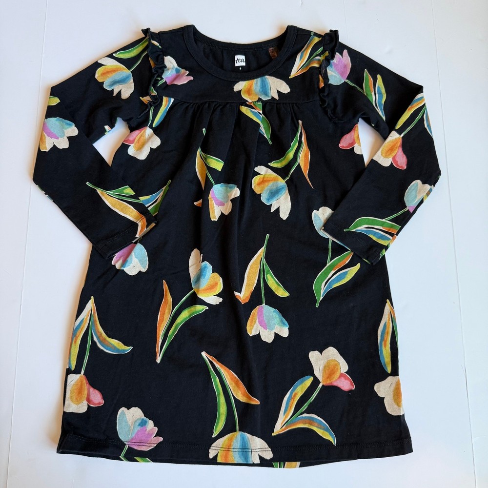 Girls 4, Tea Collection, long sleeve black cotton dress. Gorgeous floral print. Small ruffle on each shoulder. 100% cotton. No stains or flaws, very very good used condition. G-4570