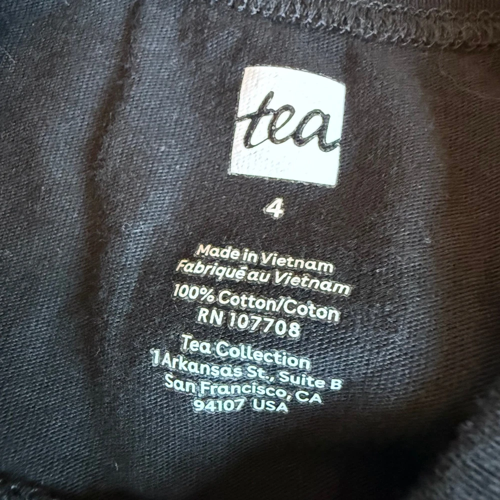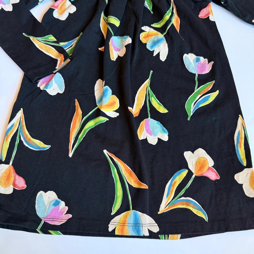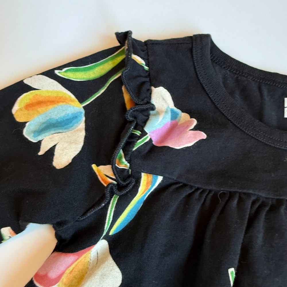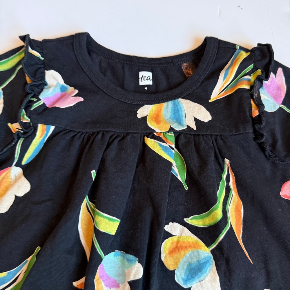 Girls 4, Tea Collection, long sleeve black cotton dress. Gorgeous floral print. Small ruffle on each shoulder. 100% cotton. No stains or flaws, very very good used condition. G-4570