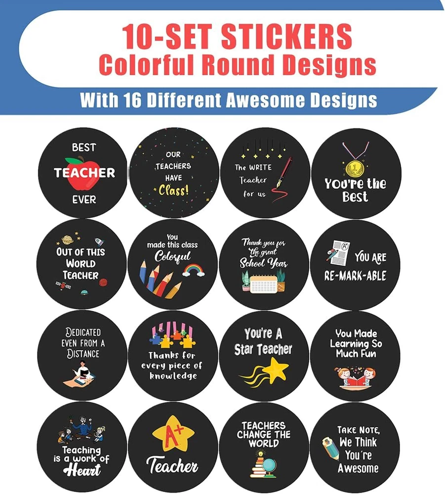 16 UNIQUE DESIGNS INSPIRING STICKERS FOR YOUR DIY PERSONALIZED DECORATIONS - Teacher Appreciation Stickers (10-Sheets x 16 Designs). These colorful and uniquely inspiring round shaped stickers are the best tool for DIY decoration and personalization of your belongings. GREAT STOCKING STUFFERS, TEACHING SUPPLEMENTARY MATERIALS, AND GIVEAWAY - Great stocking stuffers gifts for Home Teachers, Principals, Educators, Students. A perfect design to give during guidance sessions, classroom activities, school giveaways, birthdays, anniversaries, family day, and any other special occasions. MADE WITH DURABLE AND WATERPROOF MATERIALS - There is a lamination or coating to make the stickers high water resistant, and WILL NOT fade from the water. The stickers can stick it anywhere you like, and it sticks there and lasts a long time. A COLORFUL AND DECOR STICKER DECAL - Each sheet with 16 individual round stickers. There are 10 Sheets, with a total of 160 pieces of stickers. STICKER SIZE: 1.5 INCHES IN DIAMETER Teacher Appreciation Stickers (10 Sets X 16 Designs) COLORFUL AND COLLECTION OF TEXT STICKERS • Well designed. • Very encouraging. • Self-adhesive. Teacher Appreciation Stickers (10 Sets X 16 Designs) are super fun to collect; you can't have just one! That's why you will find a selection of stickers right here. Each package comes with different stickers in a variety of designs. Stick them here, stick them there, stick them everywhere! Everyone will love these self-adhesive stickers. These colorful stickers are perfect for any adults and these come with very inspiring messages and bright pictures. A fun, inexpensive way to add a decorative, notes, and stationery. Delight yourself with uplifting messages designs that are very encouraging. Teacher Appreciation Stickers (10 Sets X 16 Designs) perfect for giveaways, behavior incentives, prizes! These stickers are acid-free, nontoxic, and safe for use on photos. This product comes with a 60 days money back guarantee. You can return them to us for a full refund.