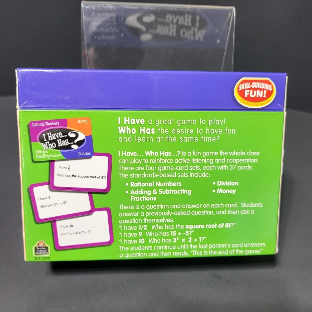 Math I Have Who Has Interactive Game Cards Grades 4-5 a fun educational game designed for students in grades 4-5. This interactive card game reinforces active listening and cooperation while teaching key math concepts. The game includes four sets of 37 cards each, covering Rational Numbers, Adding & Subtracting Fractions, Division, and Money. Students answer a question and then ask the next question, creating a chain of learning until the game concludes. Developed by Teacher Created Resources, this game is ideal for classroom use. Type: Cards Department: Kids Subject: Math Age Level: 8-11 Years Keywords: math game, interactive learning, grades 4-5, fraction practice, division skills, money math, rational numbers, classroom game, educational toy, skill building, student engagement Thank you for supporting our small business!