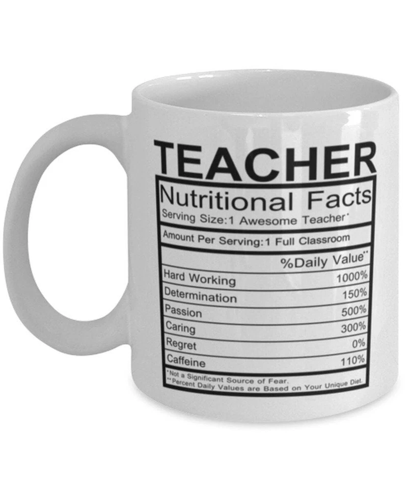 Teacher Funny Coffee Mug Nutrition Facts - White Coffee Mug Product Details.. This high quality 11oz. ceramic white mug has a premium hard coat that provides crisp and vibrant color reproduction sure to last for years. Perfect for all hot & cold beverages. The highest quality printing possible is used. It will never fade no matter how many times you wash it. Material: 100% Ceramic. Print both sides. Dishwasher and Microwave Safe. High Gloss + Premium White Finish. Printed in the U.S.A. Personalized & Custom. We support personalized and custom mug to add custom, when placing an order, you can add notes to the "order note" in shipping address section. Also you can contact us directly via message. Shipping Info. Ready to ship in 1 to 2 business days, All products are made-to-order and proudly printed in the United States. Shipped by USPS and DHL, You will receive your order in 5-7 days. Replace & Refund. All products are defective during shipping broken, chipped will be replaced free of charge. You are not satisfied with the product, we will refund 100% money to you. If any other issues arise, please do not hesitate to message, we would be more than happy to assist you.