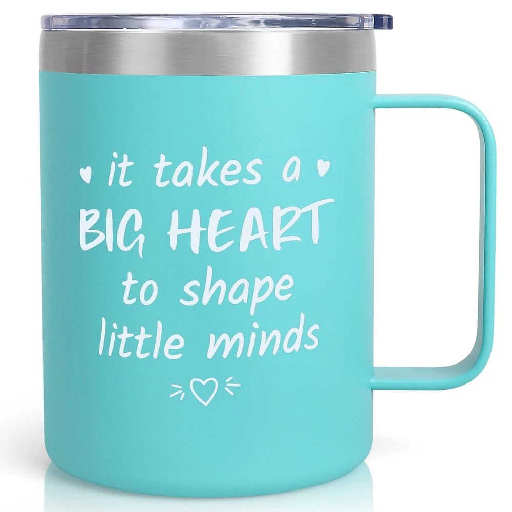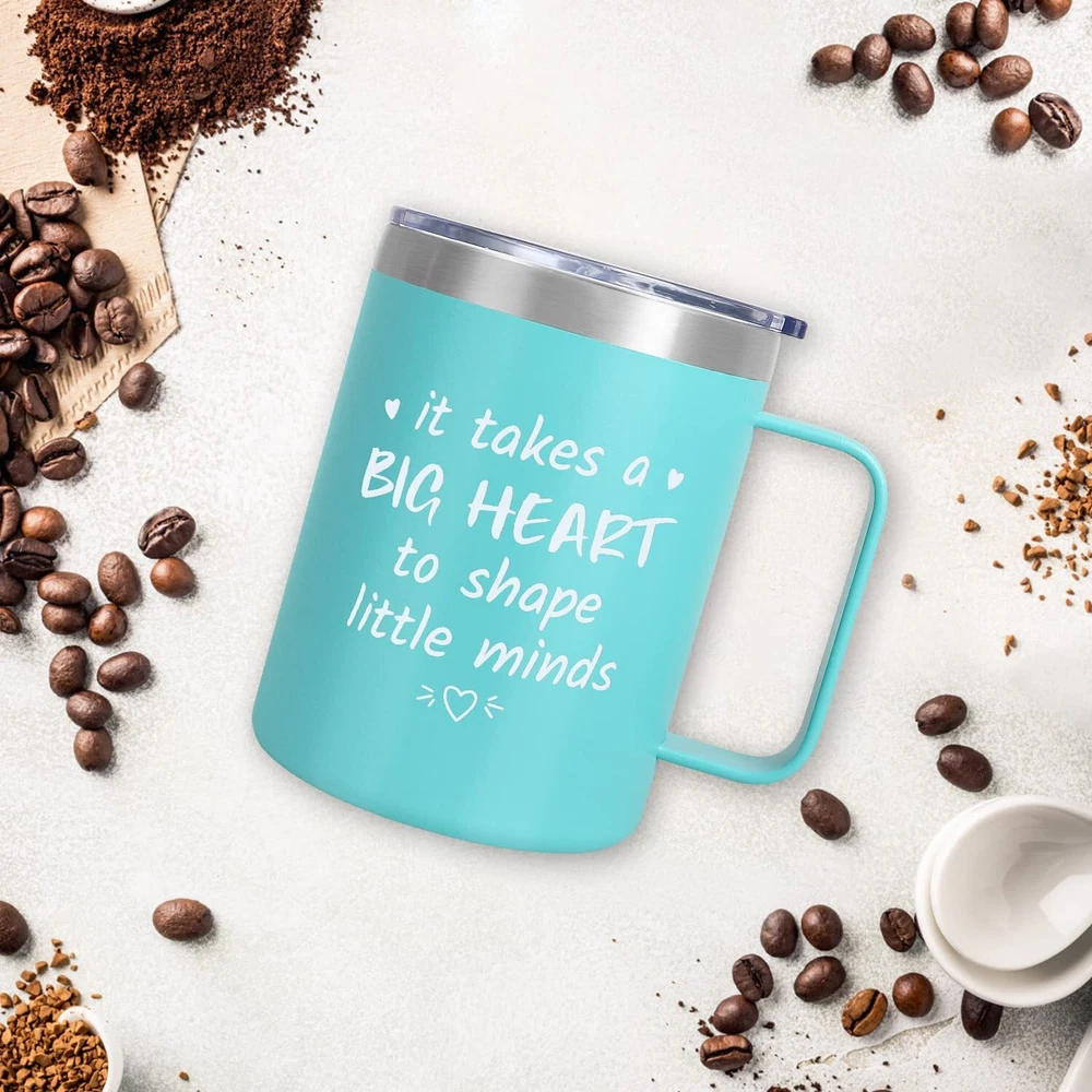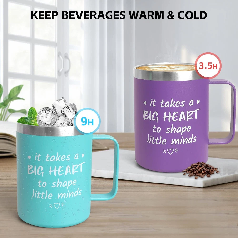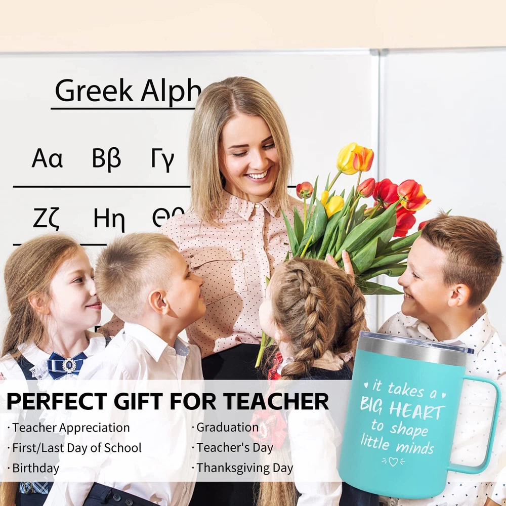Teacher Gifts for Women, Teacher Appreciation Gifts from Students, Thank You Gift for Valentine's Day, Birthday, Christmas, Graduation, Appreciation Week, Stainless Steel Tumbler Coffee Mug Cup GREAT GIFTS for TEACHER: Looking for a cute ideal gift for teacher? Wanna put a smile on teachers' face? Your teacher will definitely love this food grade insulated stainless steel coffee mug. It's the perfect gift as a reminder to tell teachers how special they are in your life DOUBLE WALL VACUUM INSULATION: Our coffee mug is equipped with double-wall vacuum insulation, which helps to keep hot drinks for 3.5 hours and cold drinks for 9 hours. A handy handle & leak-proof lid are equipped for daily use, it helps teachers enjoy every sip with different beverages, such as coffee, coke, milk, etc PREMIUM STAINLESS STEEL: This premium food grade stainless steel tumbler is unbreakable, sweat proof, rust resistant and perfect for daily use BPA-FREE & LEAKAGE-PROOF LID: Clear, slide splash-proof lid makes this cute novelty tumbler ideal for any occasions. BPA-free lid on tumbler ensures for secure usage. It's definely a nice choice for teachers PERFECT TEACHER GIFT from STUDENTS: Our mugs featured meaningful words “it takes a big heart to shape little minds” for teachers, nice for women and men. Suitable for many occasions, such as Teacher Appreciation Gifts, Teacher Thank You Gifts, School Counselor Gifts, Preschool Teacher Gifts, Daycare Teacher Gifts, Last/first day of shool gifts, etc