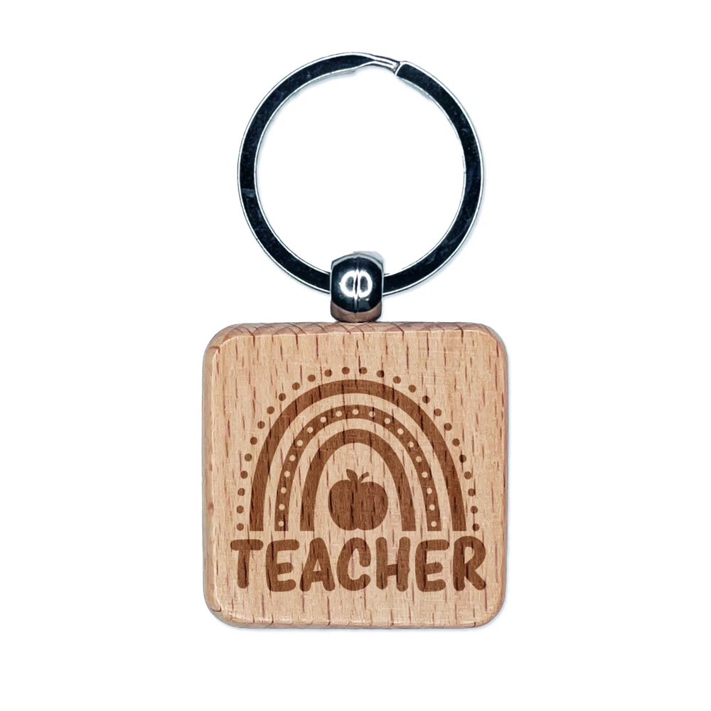 Teacher Rainbow Engraved Wood Square Keychain Tag Charm